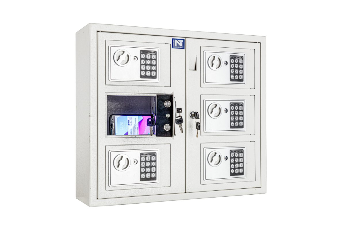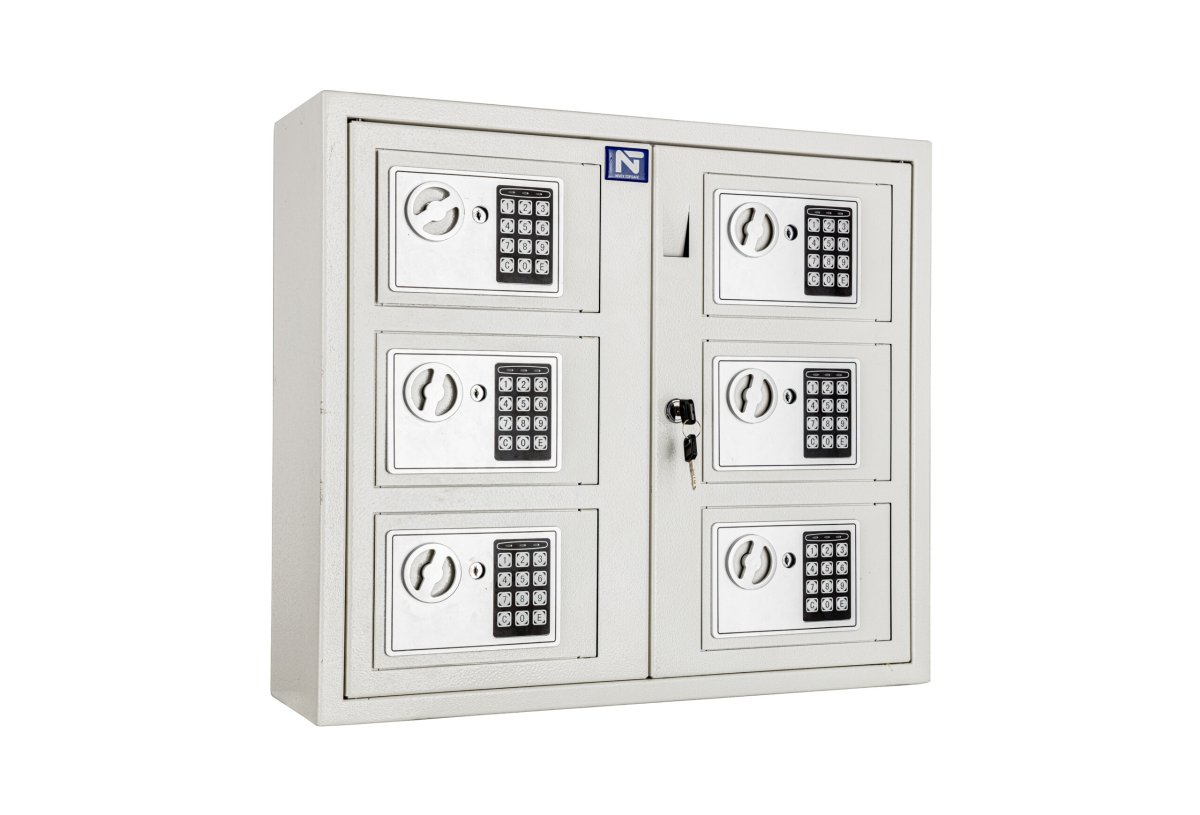 6 facksskåp med elektroniskt kodlås på varje fack. Ger utmärkt förvaringsmöjlighet på arbetsplats, skolor, sjukhus, och kontor m.m.