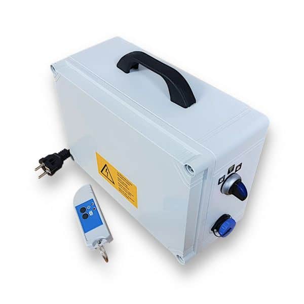 Kopplas till vägguttag, förser ADE Rotascrub med 24V. Smidig fjärrkontroll ingår. Kan rotera både framåt och bakåt.