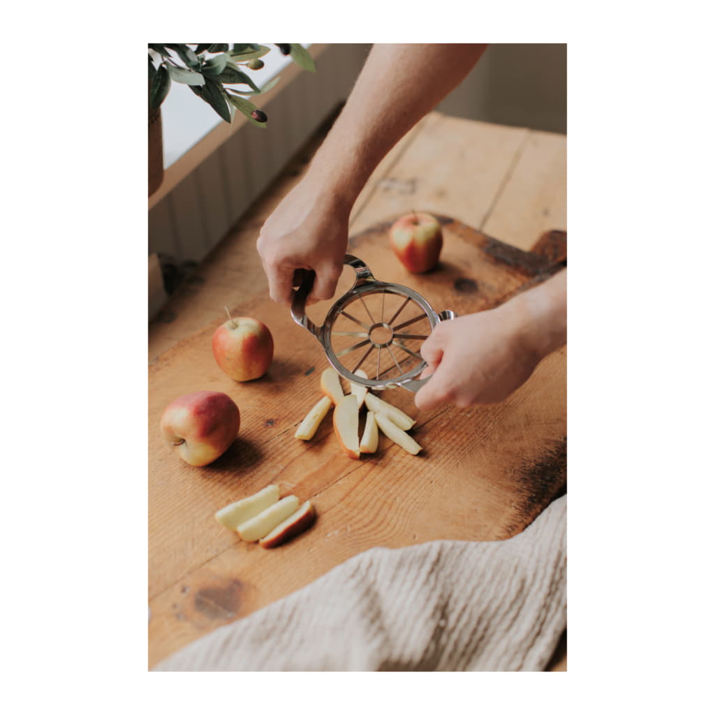 Effektivisera mellanmålet med denna äppeldelare som ger 12 perfekta klyftor på nolltid! Idealisk för snabba mellanmål, fruktsallader eller bakning. Robust, lättanvänd och utformad för att minimera slöseri. Denna äppeldelare är ett måste för alla som älskar frukt och effektivitet i köket!