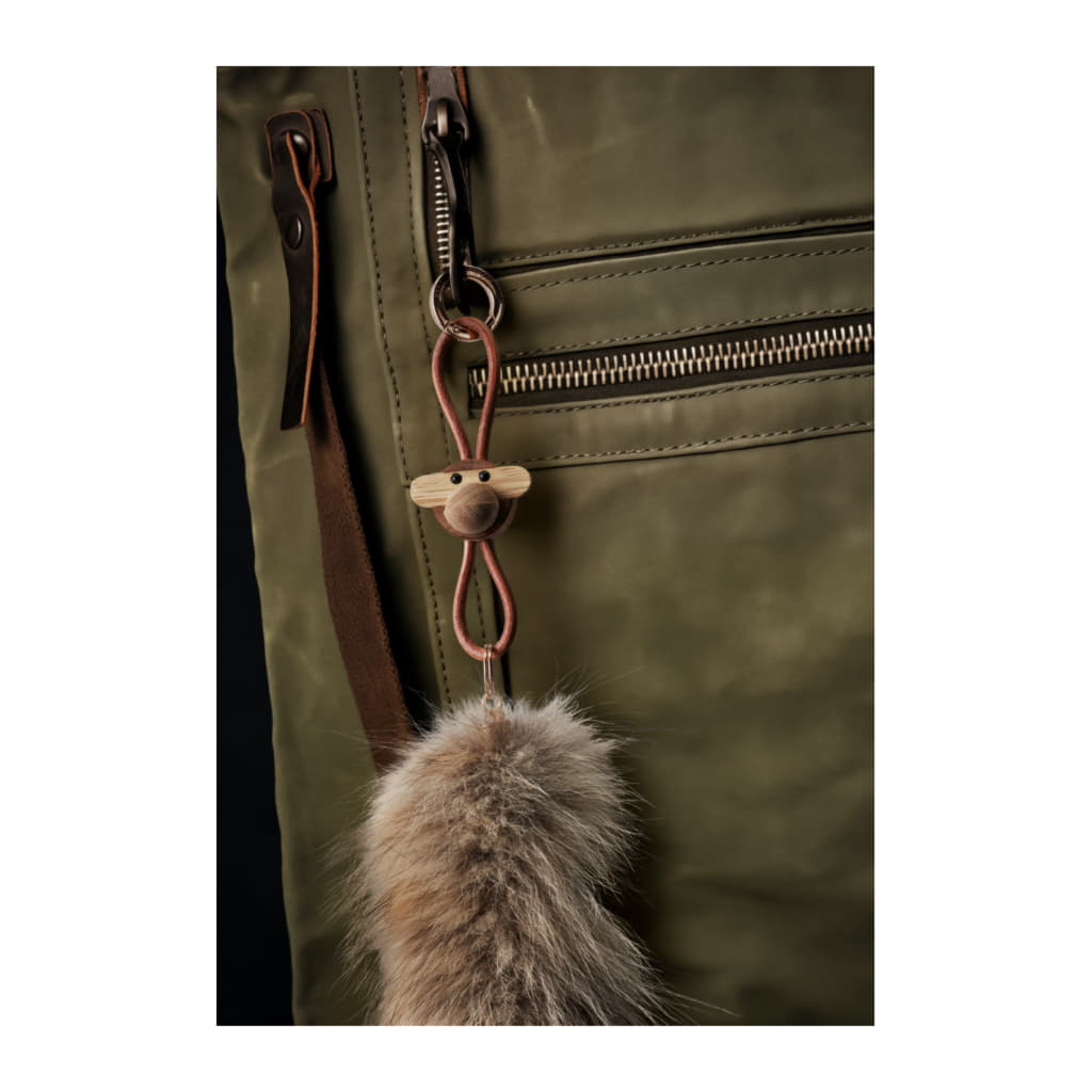 Kay Bojesen var en mästare på att tillföra små detaljer till sina träfigurer. Han fann magin i naturens eget material, och med sin enastående talang för formgivning tog den ena lekfulla figuren efter den andra form i hans fantasi och blev levande i hans händer. Två av hans största klassiker är utan tvekan apan och sångfågeln. Och även om apan i denna nyckelringsversion har skalats ner till endast 3 cm i höjd, bär den fortfarande med sig ett rikt arv av Kay Bojesens designhistoria vart du än går. Denna Kay Bojesen-nyckelring har apans karakteristiska huvud, tillverkat i den välkända kompositionen av vackert oljad FSC®-certifierad teak och kontrollerad limba, och kompletteras med en elegant och praktisk naturfärgad snodd i äkta läder. Snodden kan justeras upp och ner i förhållande till figuren, så att du kan skapa ditt helt egna uttryck. Överst sitter en stor guldfärgad nyckelring graverad med Kay Bojesen Denmark, som både fungerar som en stilren detalj och en praktisk funktion med sin smarta karbinhake för enkel öppning och stängning. Under figuren hänger tre extra nyckelringar, så att du har gott om plats för alla dina nycklar.