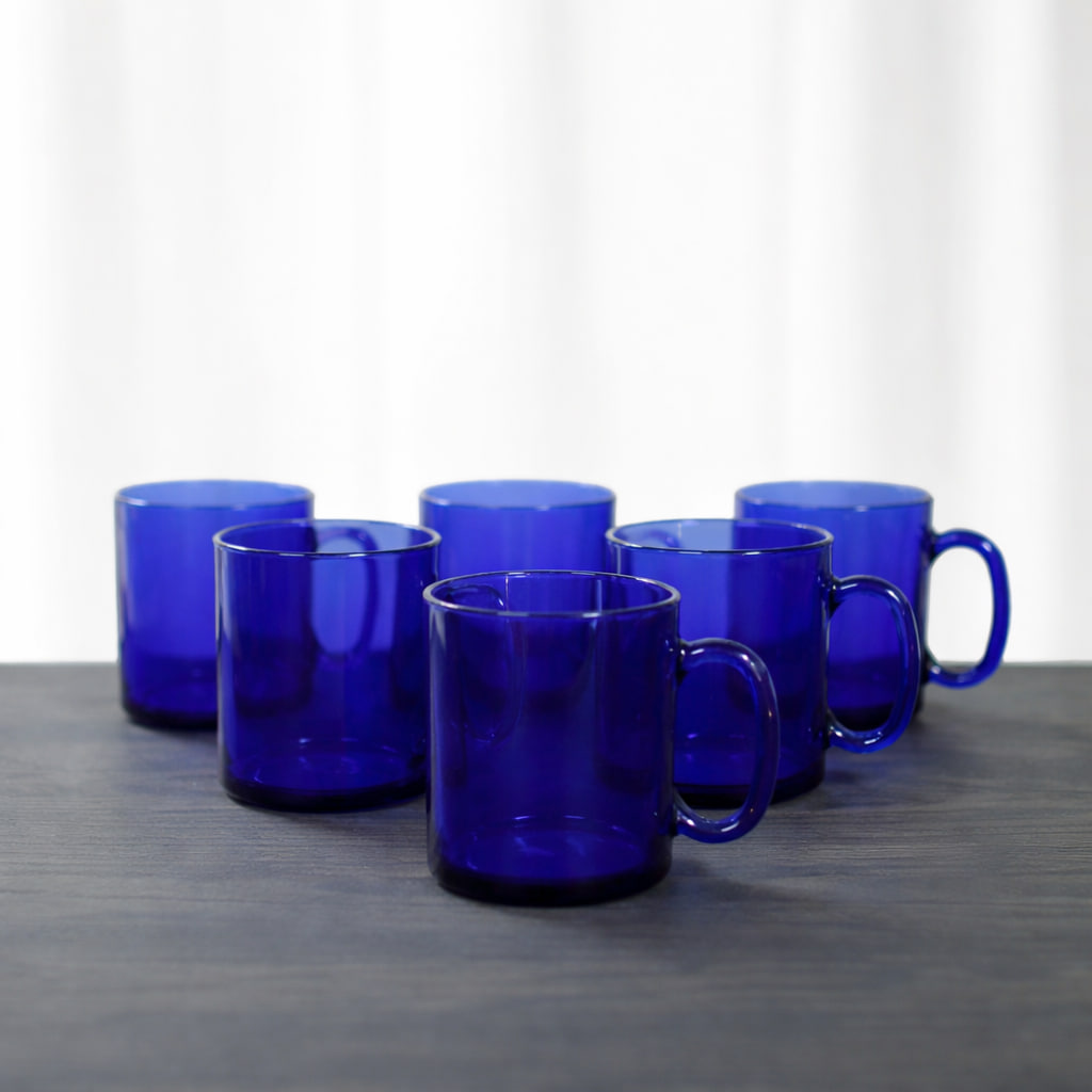Vackra blå glas-muggar från Arcoroc, kända för sin höga kvalitet och tidlösa formgivning. Dessa muggar är tillverkade i tåligt pressglas i en djup koboltblå färg som ger dem ett elegant och harmoniskt uttryck på bordet.