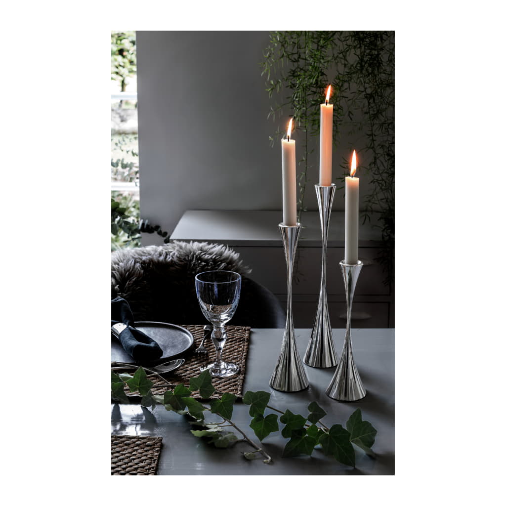 Den klassiskt formade Arden ljusstaken har moderniserats med eleganta linjer och en avsmalnande midja. Dess spegelpolerade finish och mjuka kurvor ger en stilfull och sofistikerad känsla, perfekt för både matbord och spiselkrans.