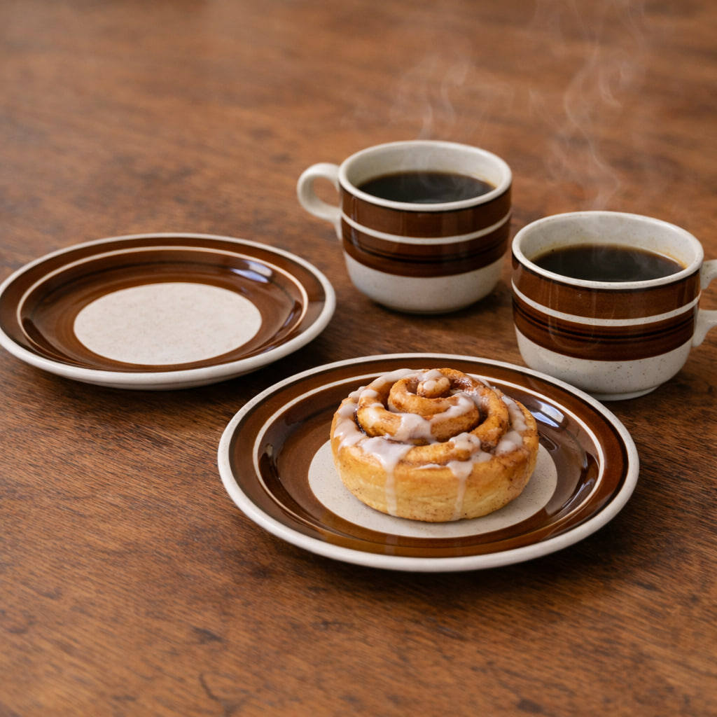 Assietten är tillverkad i flintgods och dekorerad med Isoldes karakteristiska bruna band och subtila svarta ränder, vilket ger ett harmoniskt och lätt igenkännbart uttryck. Den neutrala mittdelen i ljus ton skapar en fin kontrast mot dekoren och gör assietten enkel att kombinera med övriga delar i serien eller annat porslin.