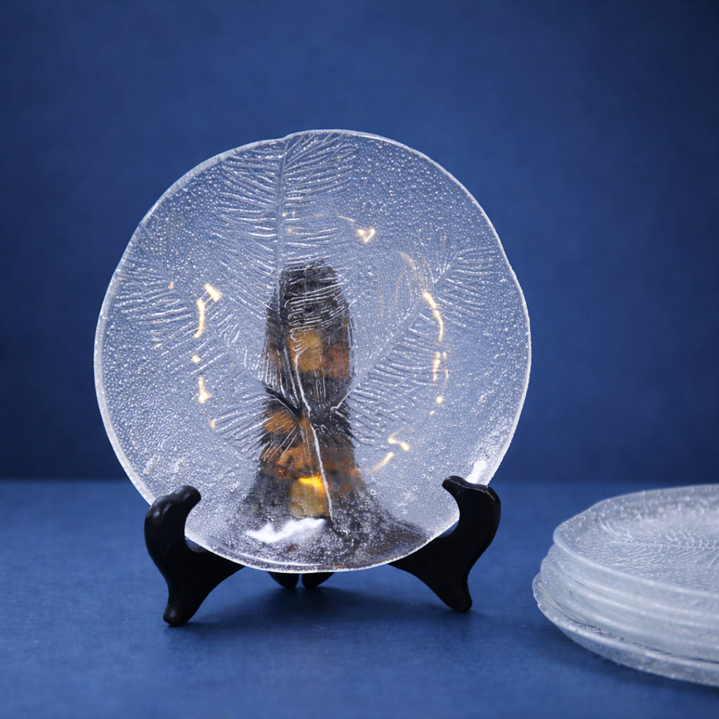 Vacker assiett i glas ur serien Tallkrona, formgiven av Bengt Edenfalk för Royal Krona. Assietten har ett tydligt reliefmönster som föreställer barr och kvistar från tall, vilket ger ett naturligt och lugnt uttryck.