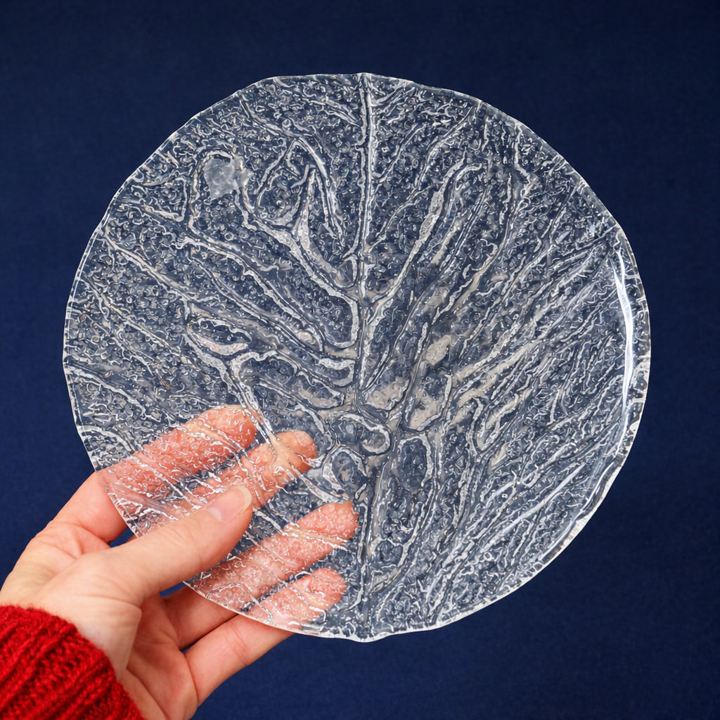 Vackra och dekorativa assietter i glas från 1960-talet, formgivna av den tjeckoslovakiske glasdesignern Vladislav Urban för Nový Bor / Borocrystal. Assietterna är tillverkade i tjockt, klart glas och har en organisk, naturinspirerad form som tydligt påminner om bladens nervstruktur.