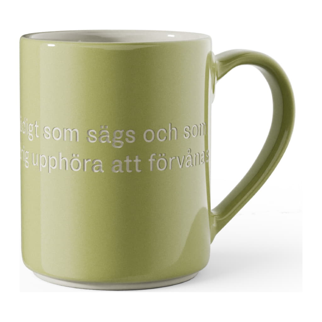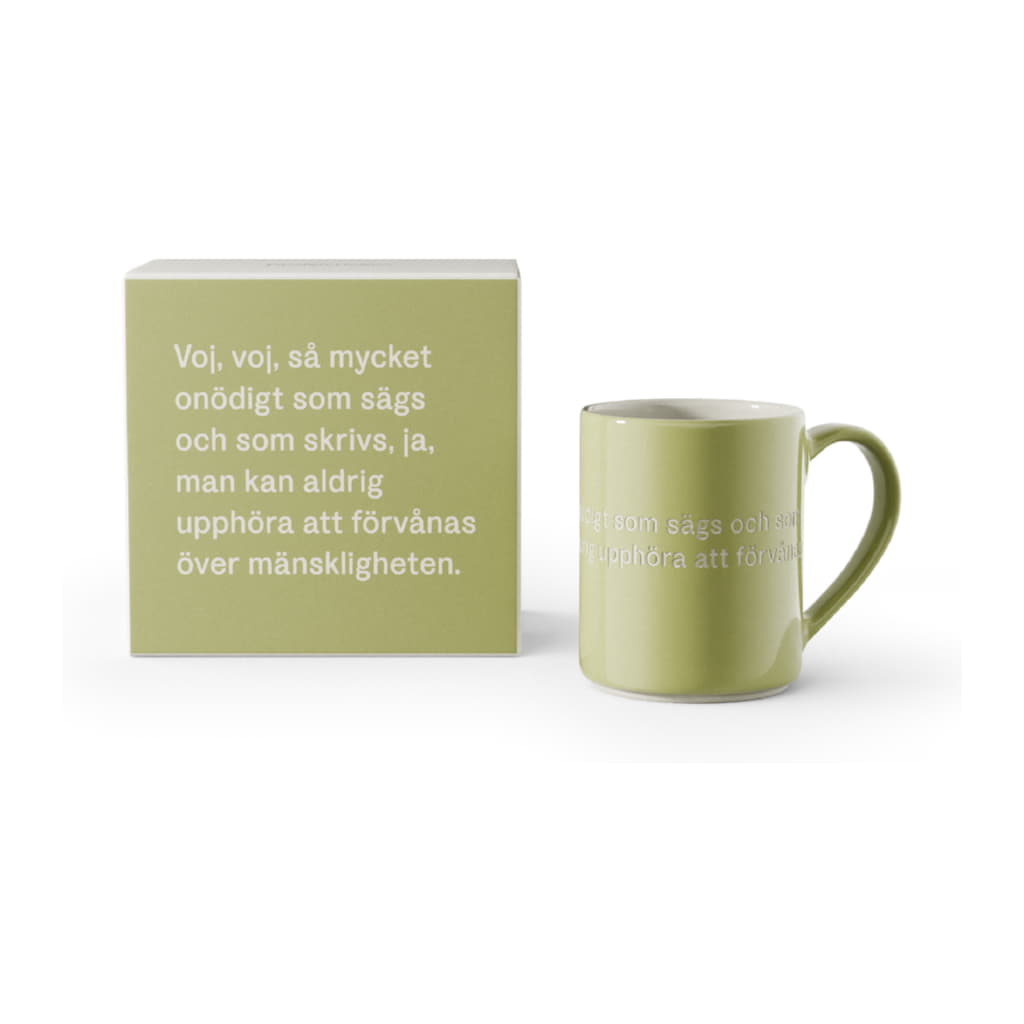 Mugg med citat från Astrid Lindgren själv: Voj, voj, så mycket onödigt som sägs och som skrivs, ja, man kan aldrig upphöra att förvånas över mänskligheten