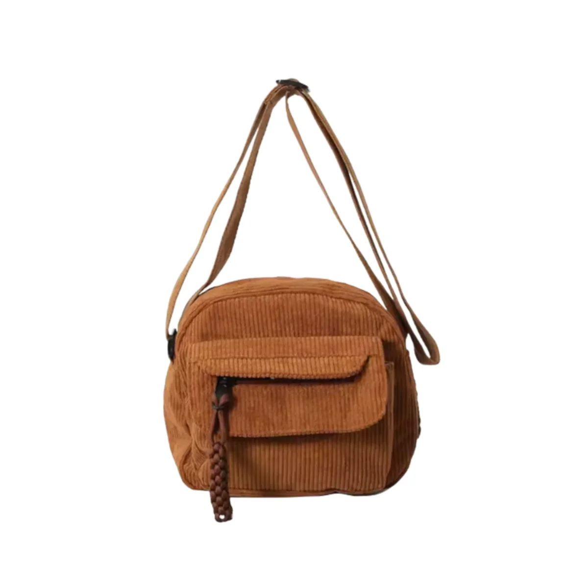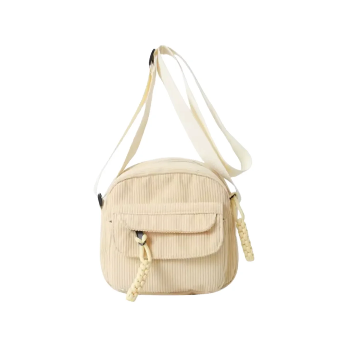 Use the exact same cream white corduroy crossbody bag from the reference image. The bag must remain identical in color, fabric texture, zipper, braided zipper pull and strap design. Small compact crossbody bag 19 × 19 × 7 cm with realistic proportions.