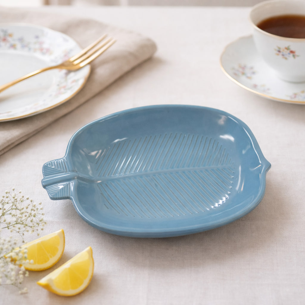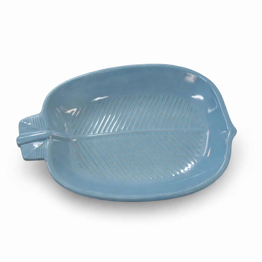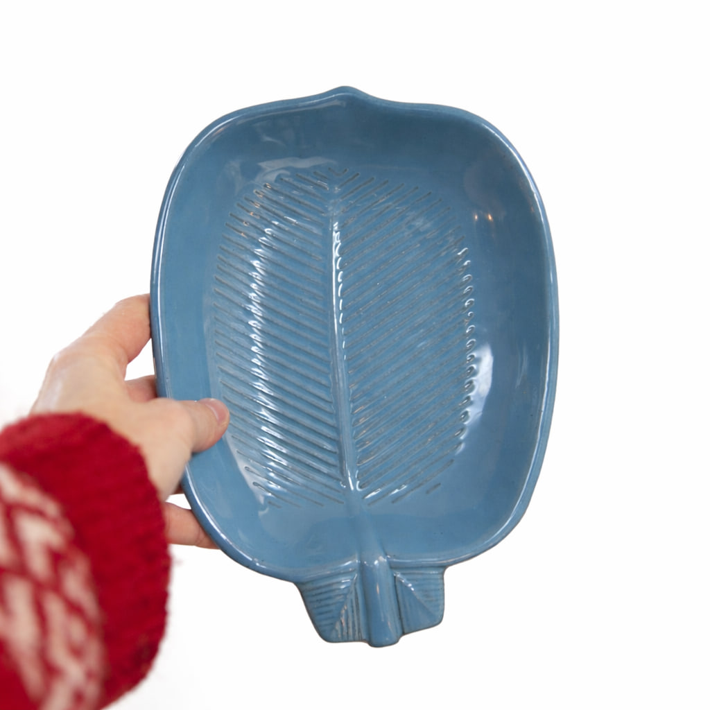 Blått fat med lövform – vintage keramik