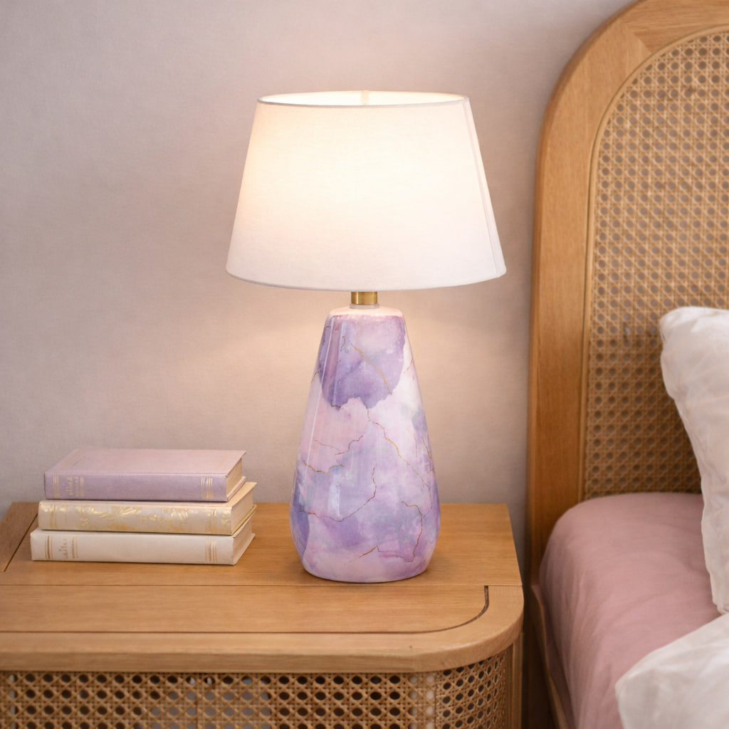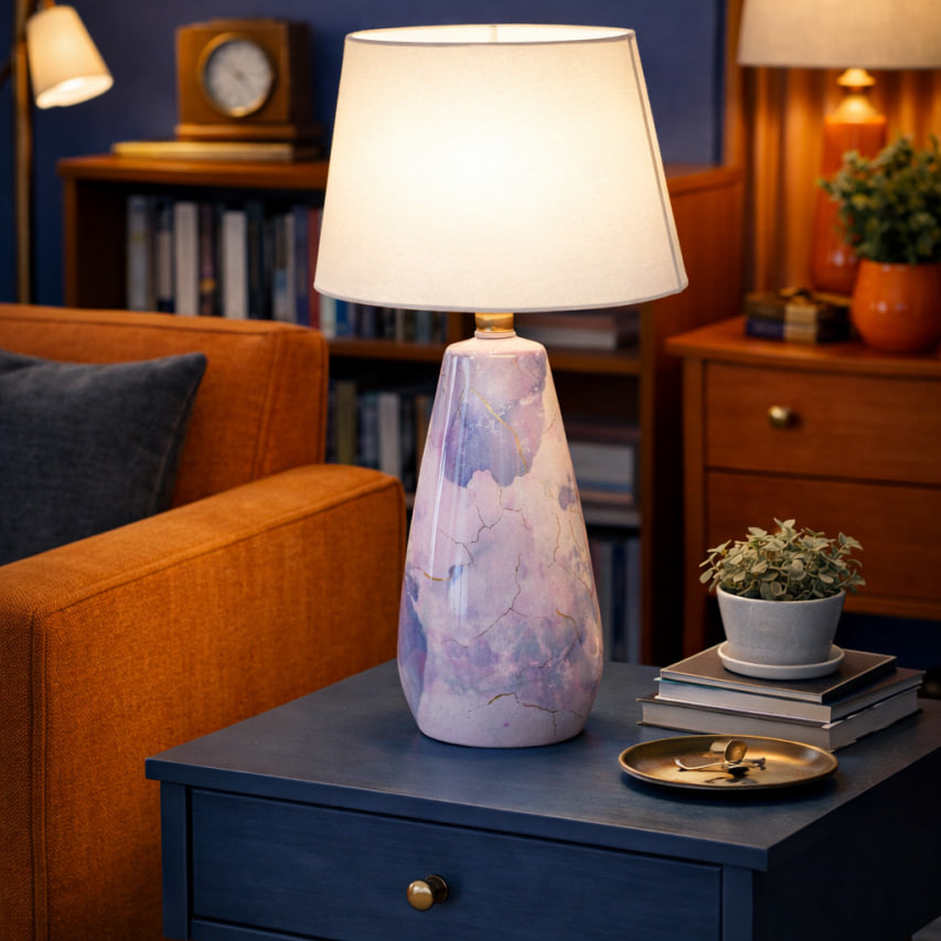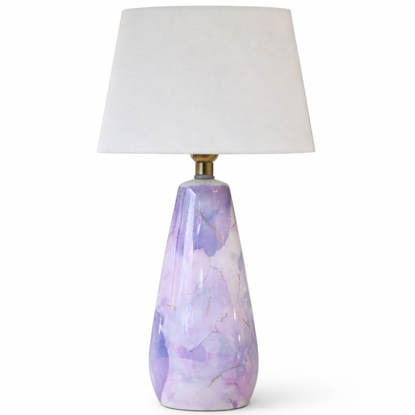 Elegant handgjord bordslampa i porslin med mjukt organiska nyanser i lila, rosa och vitt, förfinad med subtila guldlinjer som ger intryck av kintsugi – japansk konst att laga med guld. Lampfoten har en glaserad, glänsande yta där färgerna flyter in i varandra som akvarell, vilket skapar en harmonisk och poetisk känsla.
