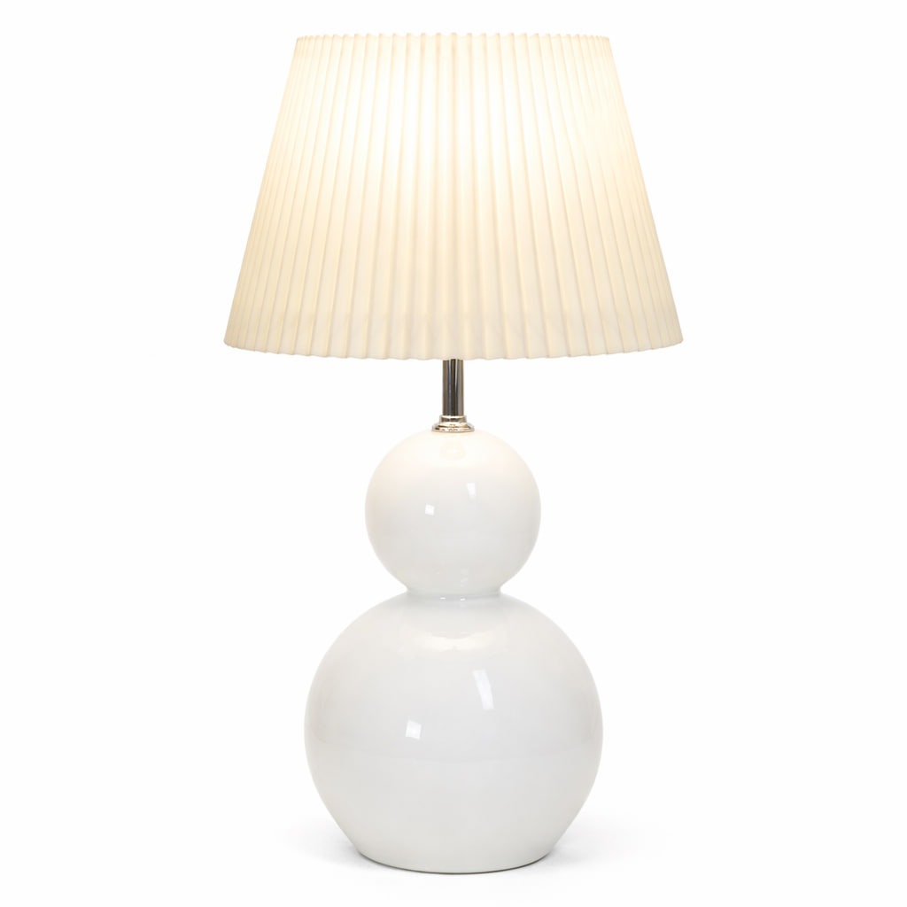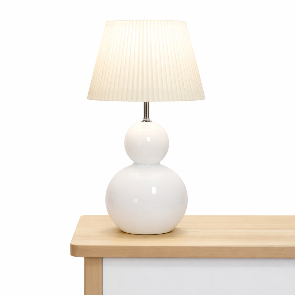 Elegant bordslampa i vitt glas med en mjukt rundad och skulptural form som består av två sammanfogade klot. Lampfoten är tillverkad i opalvitt glas, vilket ger ett behagligt och mjukt ljus när lampan är tänd och samtidigt skapar en harmonisk, modern känsla i rummet.