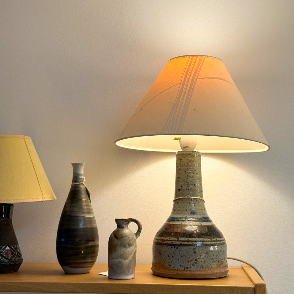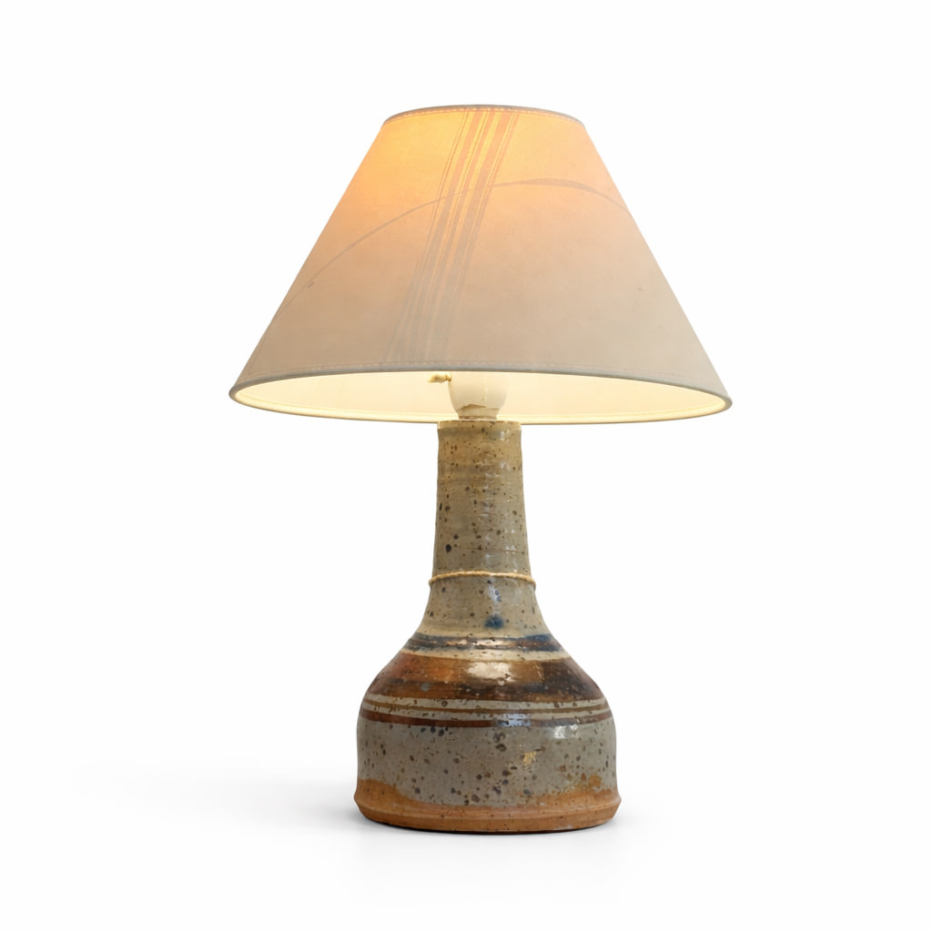 Elegant och rustik bordslampa i keramik med tydlig dansk designkänsla från 1970-talet. Lampfoten är drejad i stengods med vacker glasyr i naturliga jordtoner – beige, grå och brunsvarta nyanser som flyter samman i subtila skiftningar.