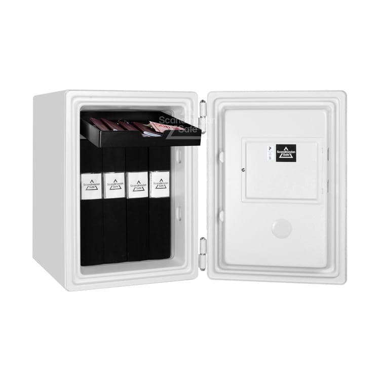 Brandsäkert dokumentskåp för förvaring av affärshandlingar, bokföringsmaterial, dokument, kontrakt etc. Rymmer upp till 4 st A4-pärmar. Passar i alla hem och kontor!