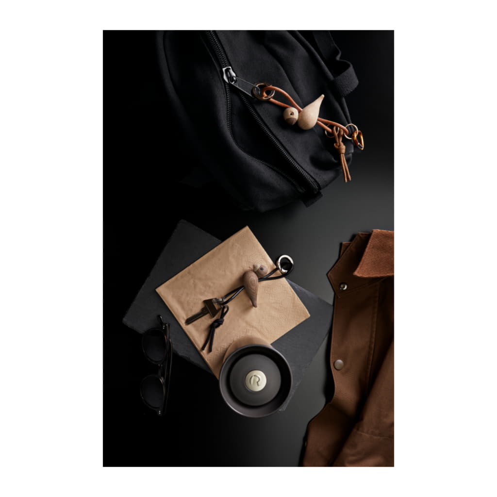 Kay Bojesen var en mästare på att tillföra små detaljer till sina träfigurer. Han fann magin i naturens eget material, och med sin enastående talang för formgivning tog den ena lekfulla figuren efter den andra form i hans fantasi och blev levande i hans händer. Två av hans största klassiker är utan tvekan apan och sångfågeln. Och även om sångfågeln i denna nyckelringsversion har skalats ner till endast 4,5 cm i höjd, bär den fortfarande med sig ett rikt arv av Kay Bojesens designhistoria vart du än går. Denna Kay Bojesen-nyckelring har sångfågeln i miniatyrutgåva, tillverkad i FSC®-certifierad rökt ek, och kompletteras med en elegant och praktisk svart snodd i äkta läder. Snodden kan justeras upp och ner i förhållande till figuren, så att du kan skapa ditt helt egna uttryck. Överst sitter en stor silverfärgad nyckelring graverad med Kay Bojesen Denmark, som både fungerar som en stilren detalj och en praktisk funktion med sin smarta karbinhake för enkel öppning och stängning. Under figuren hänger tre extra nyckelringar, så att du har gott om plats för alla dina nycklar.