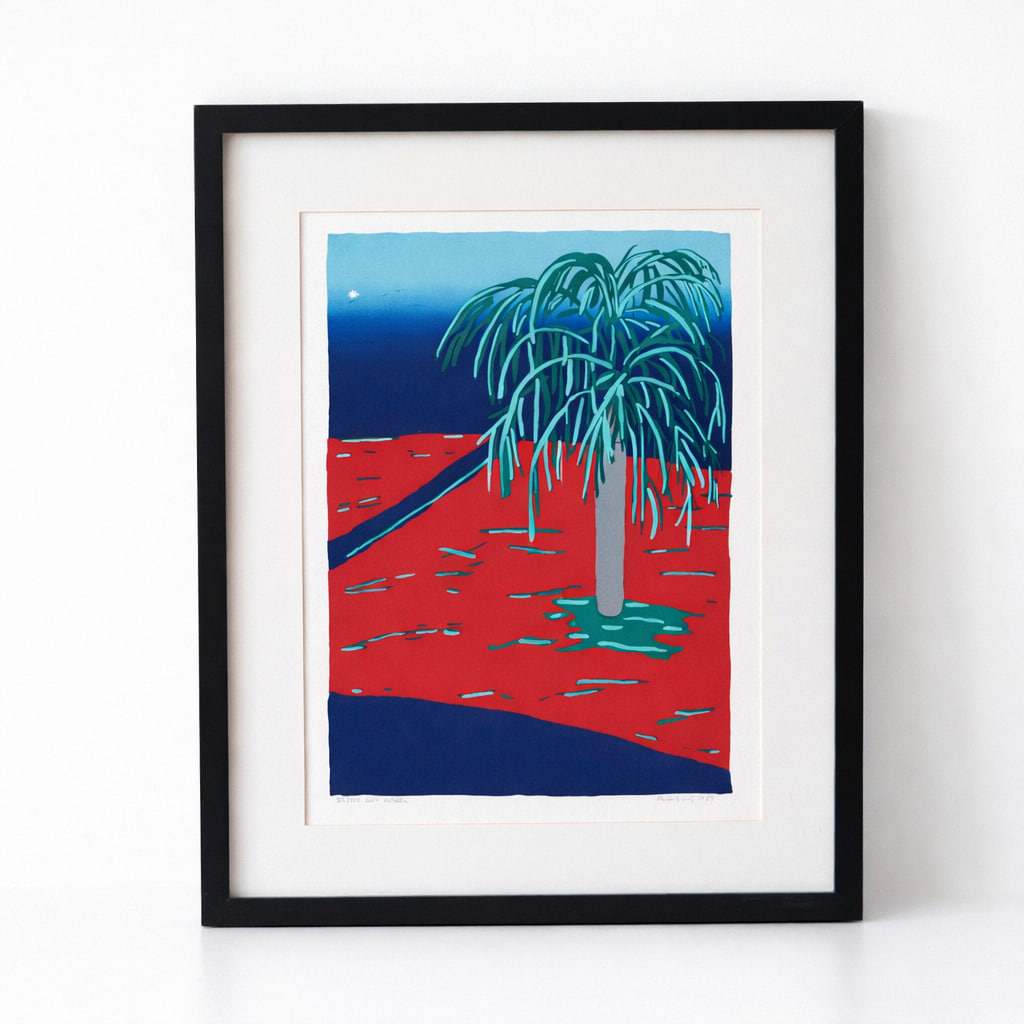 Stämningsfull färglitografi av den svenska konstnären Susan Gillhög, född 1950 i Stockholm. Verket Una Strella är ett tydligt exempel på Gillhögs karakteristiska bildvärld med starka färgfält, klara kontraster och ett poetiskt, nästan drömlikt uttryck.