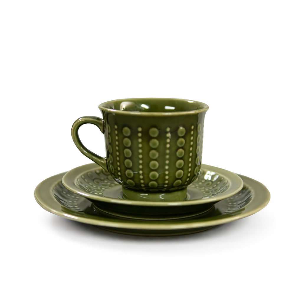 Elegant vintage kopp i djup grön glasyr med dekorativt reliefmönster i form av upphöjda prickar. Koppen kompletteras av matchande fat och assiett i samma stilrena formspråk, vilket ger ett harmoniskt och genomarbetat uttryck. Den blanka glasyren och den taktila ytan gör servisen både visuellt och känslomässigt tilltalande.