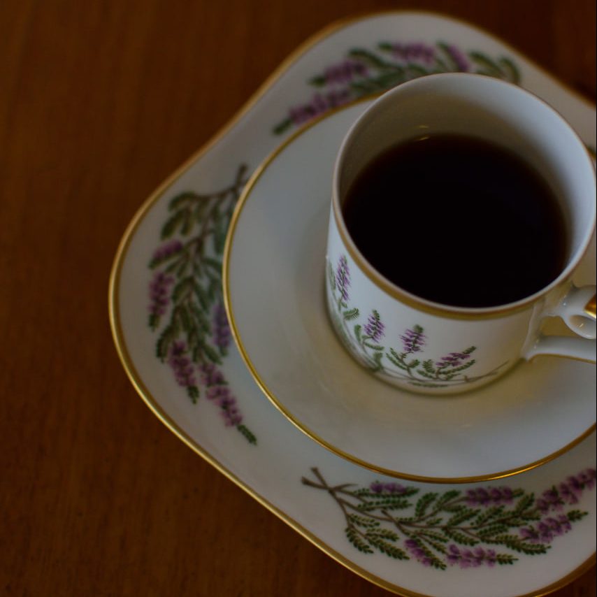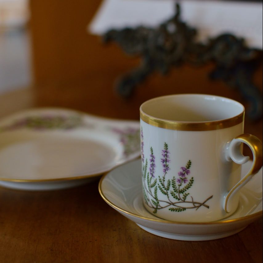 Fina klassiska kaffekoppar från Hackefors i porslin med polykrom dekor av ljung samt gulddetaljer. Finns 12 stycken i lager i butiken i Älvsjö.