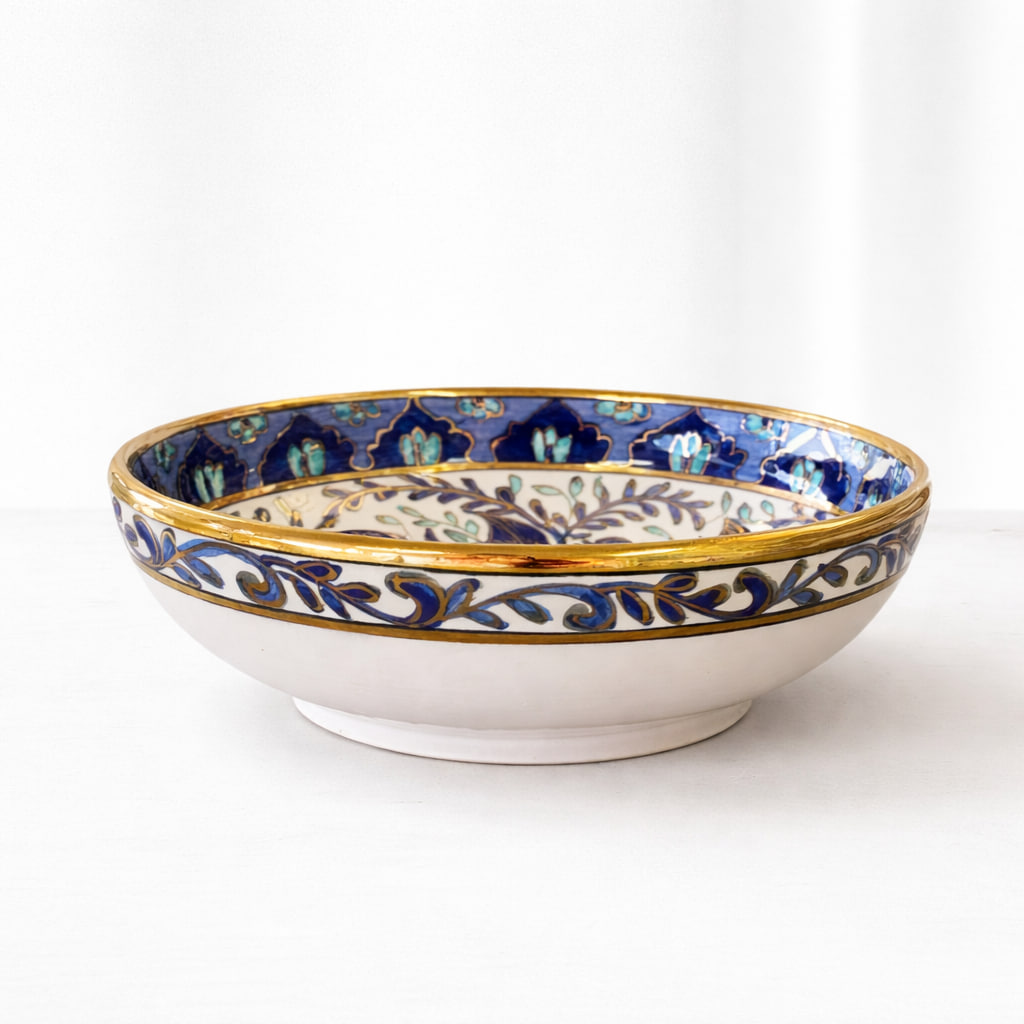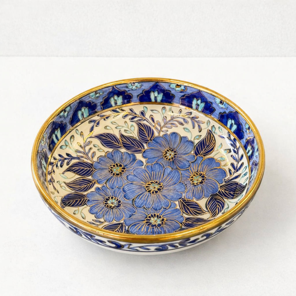 Ett vackert handmålat fat i keramik från Grekland med en rik och detaljrik blomsterdekor i djupa blå nyanser. Fatet pryds av ett klassiskt medelhavsinspirerat mönster med blommor och blad, där varje penseldrag vittnar om hantverksskicklighet och tradition.