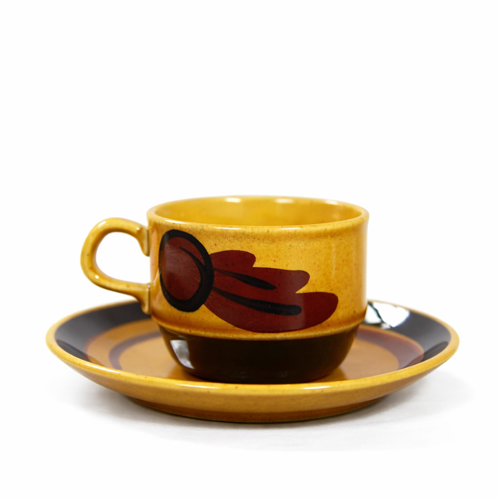 Kaffekopp med fat och assiett ur serien Tuna från Rörstrand, formgiven av Carl-Harry Stålhane. Serien tillverkades under 1970-talet och är ett fint exempel på svensk retrodesign.