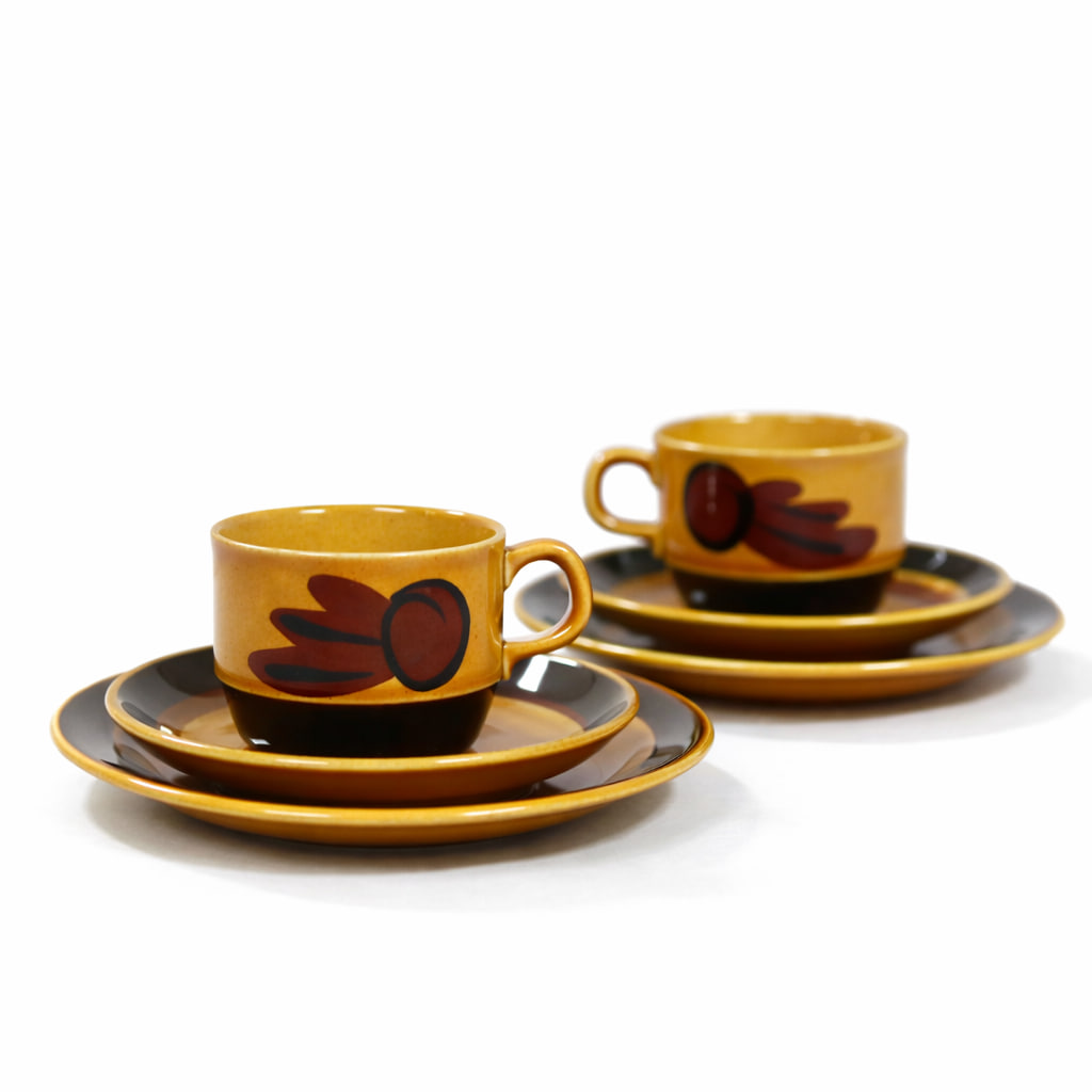 Delarna är gjorda i flintgods och har en handmålad dekor i varma gula och bruna toner. Mönstret är mjukt och grafiskt, typiskt för tiden, och ger servisen en tydlig 70-talskänsla.