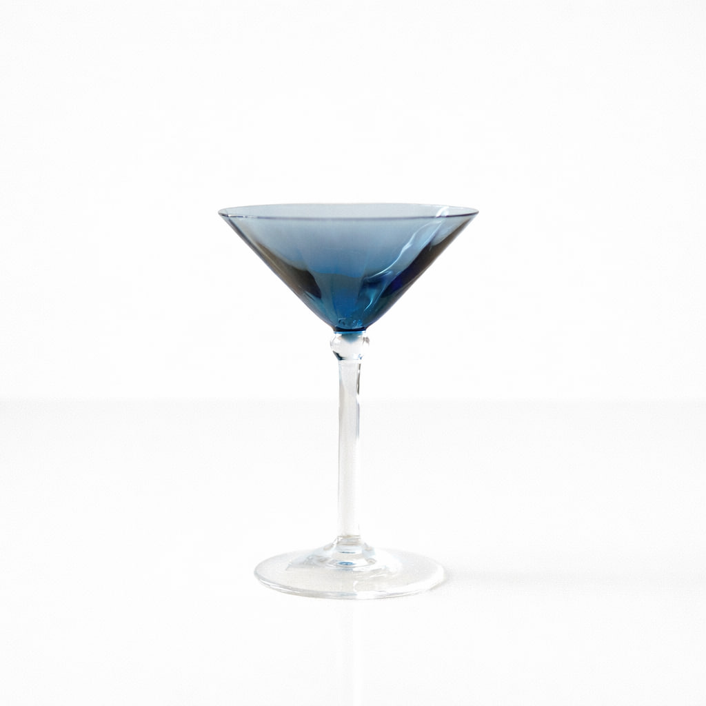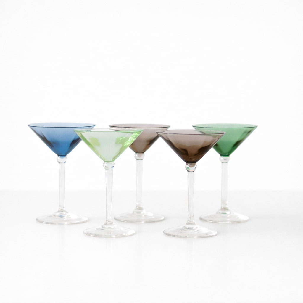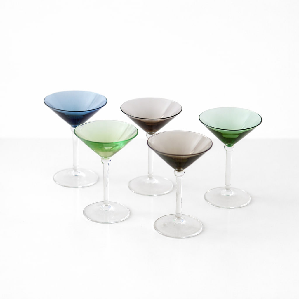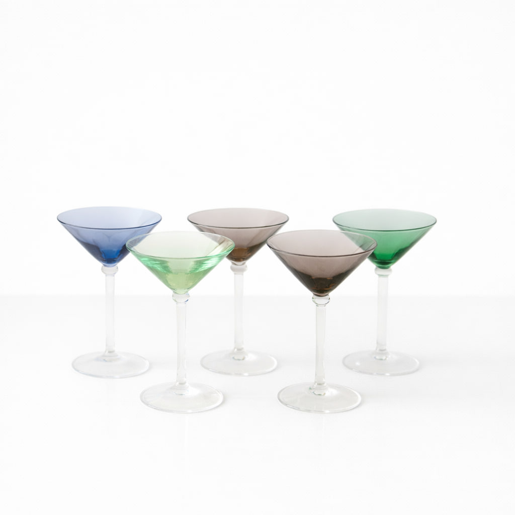Elegant set med likörglas i tunt, färgat glas med klassisk form och nätt proportion. Glasen har en vackert utsvängd kupa och hög, smal fot som ger ett lätt och sofistikerat uttryck. De olika färgtonerna – blå, grön och rökfärgad/brun – skapar ett dekorativt helhetsintryck och gör dem perfekta att mixa på serveringsbrickan eller vitrinskåpet.
