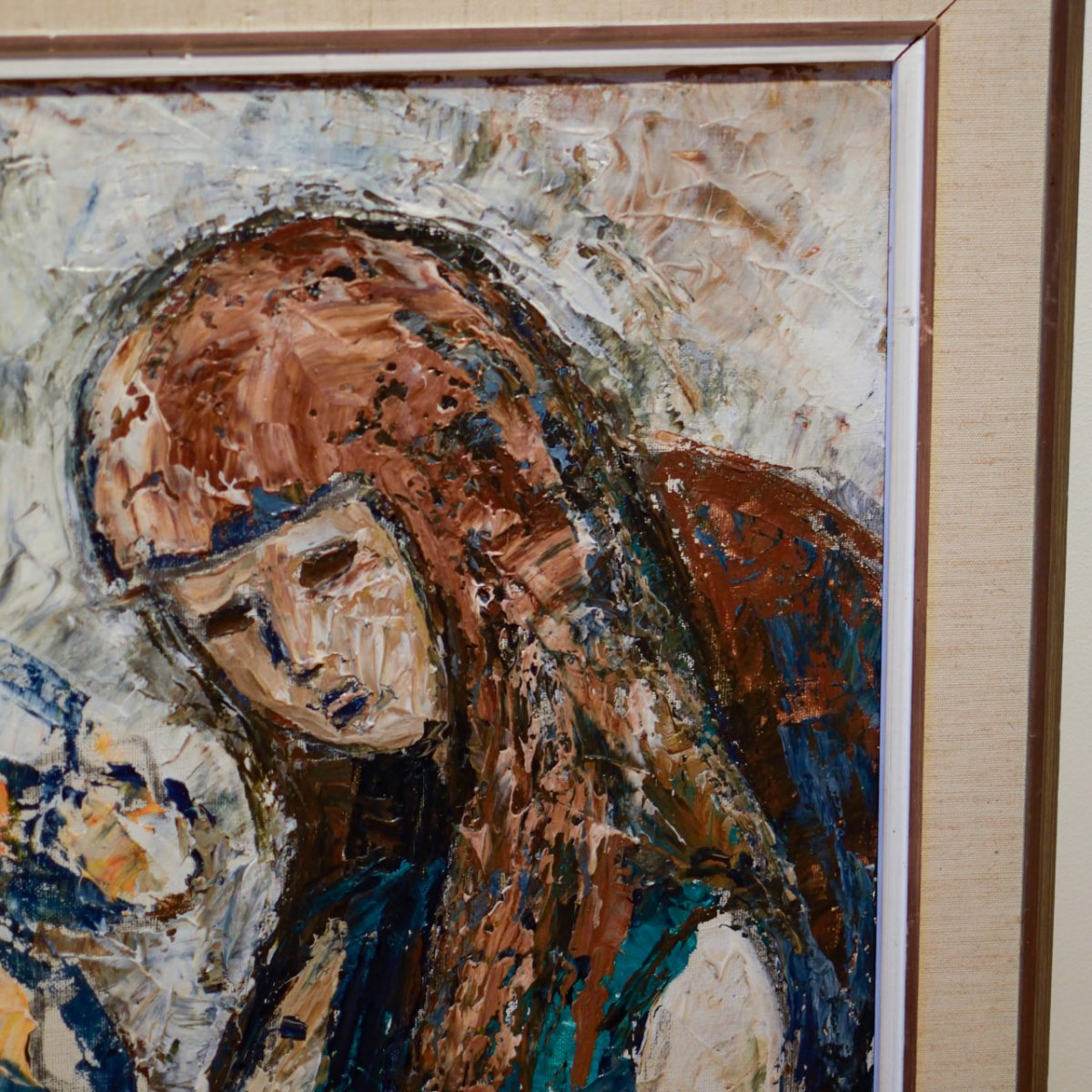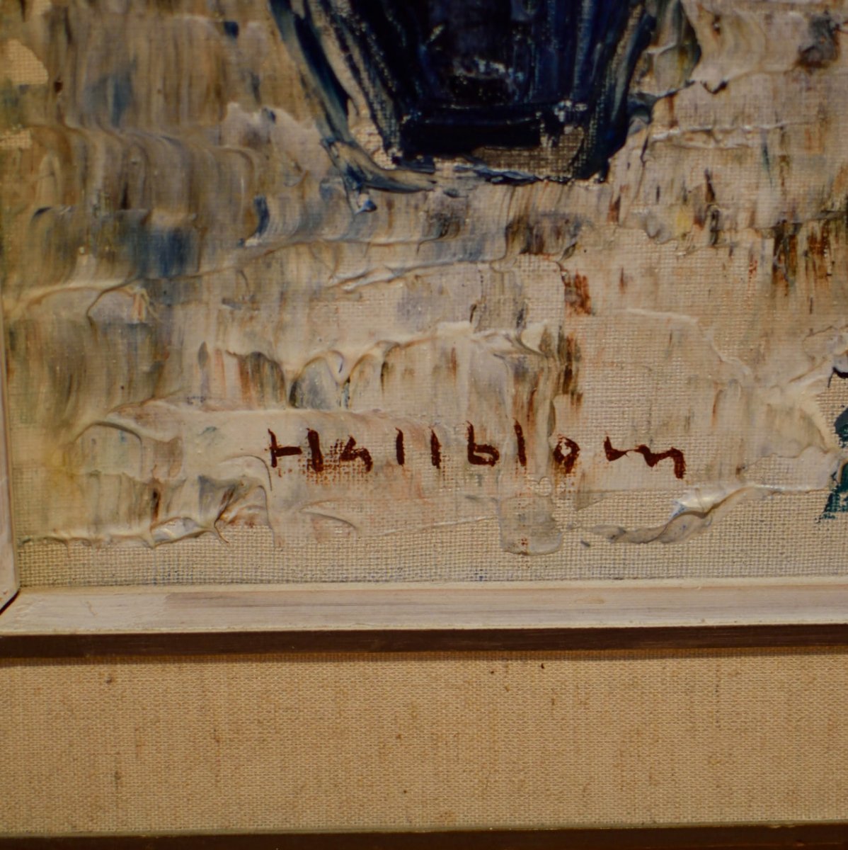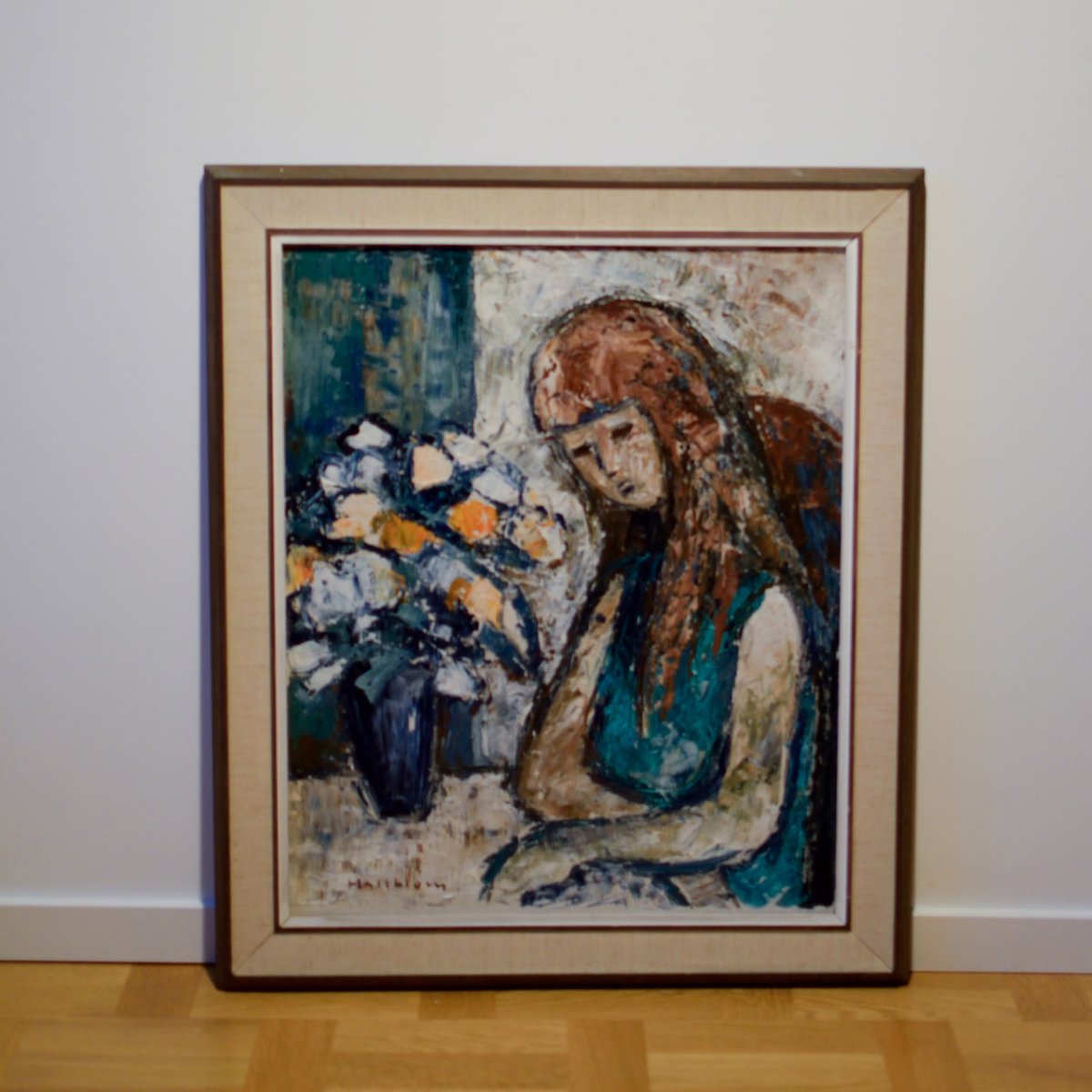 En uttrycksfull och känslosam målning av Stig Anders Bertil Hallblom (f. 1932, Uppsala), en autodidakt svensk målare känd för sina stilleben och uppländska landskap i en personlig, abstrakt-expressionistisk stil. Verket mäter 63 cm x 74,5 cm inklusive ram och föreställer en eftertänksam ung kvinna intill en vas med blommor, målad i Hallbloms karakteristiska kraftfulla och strukturrika penselföring.