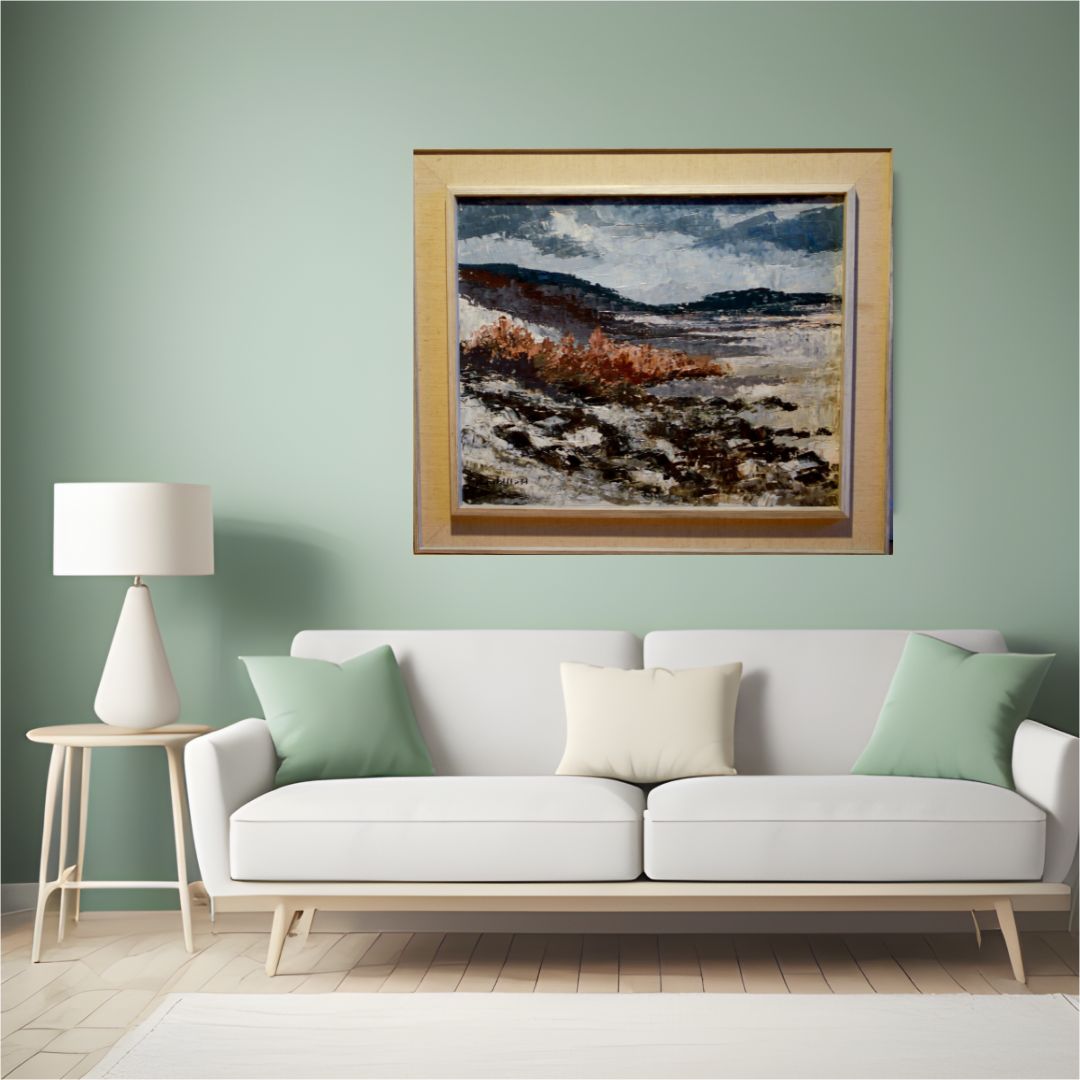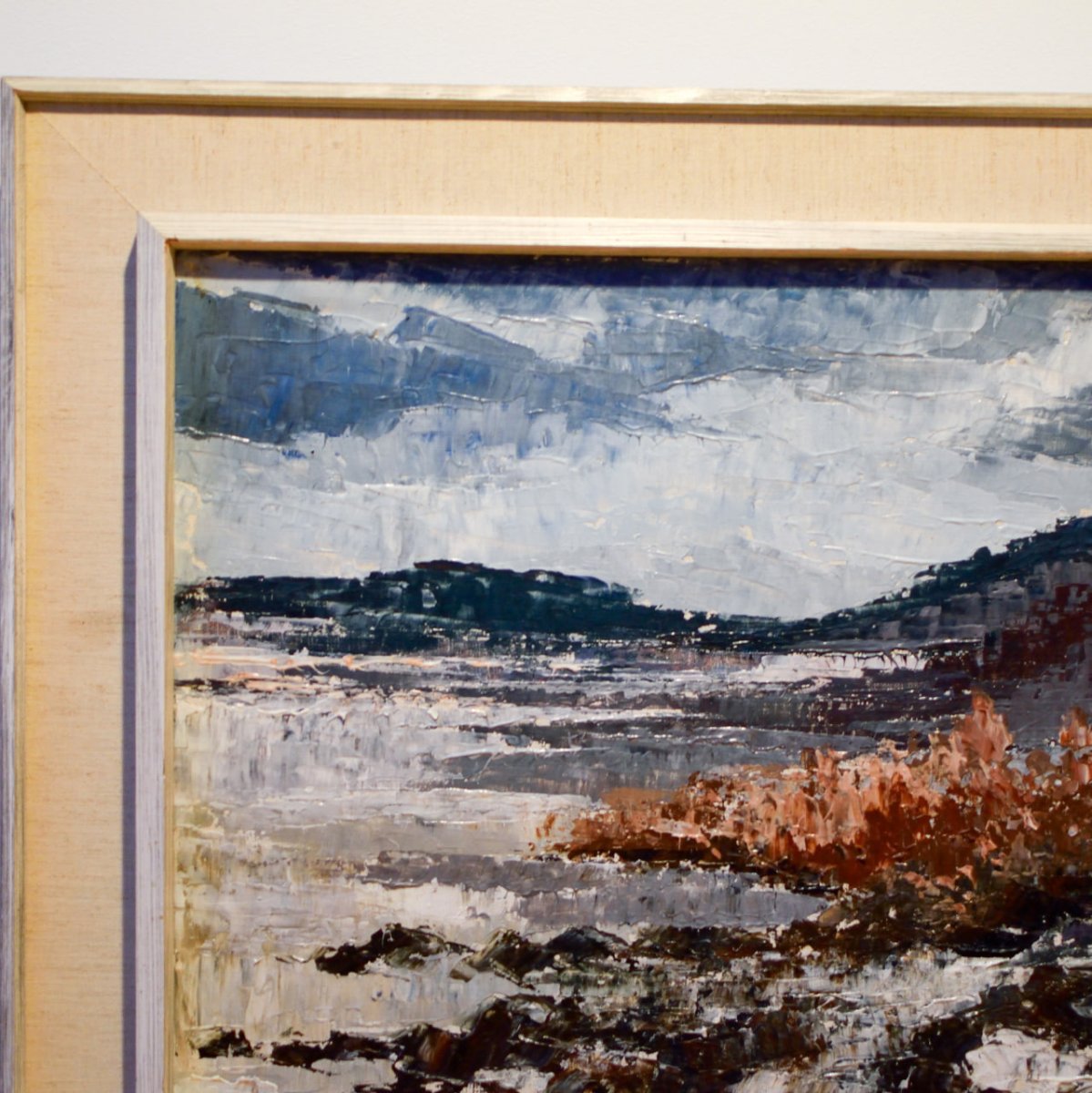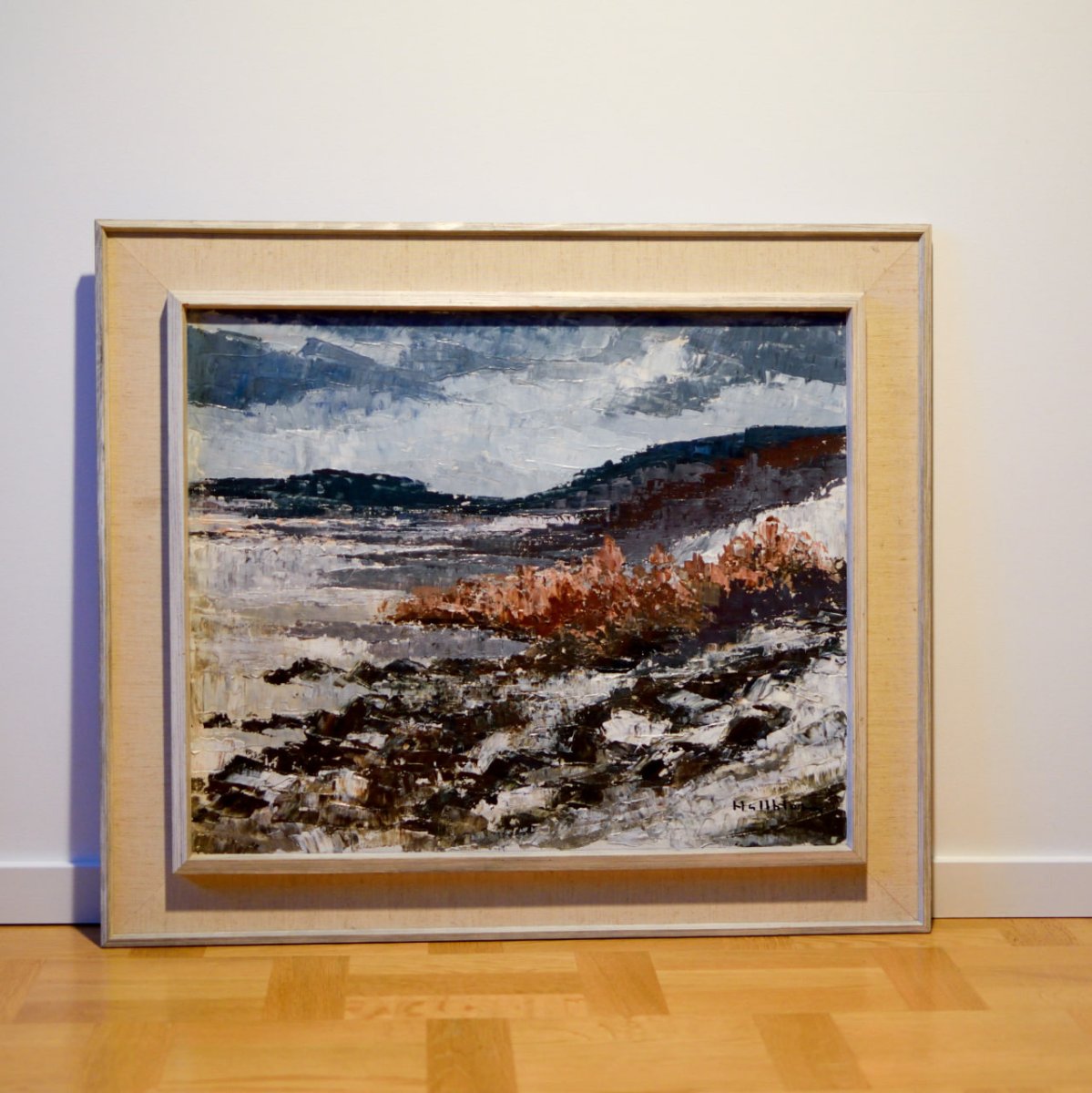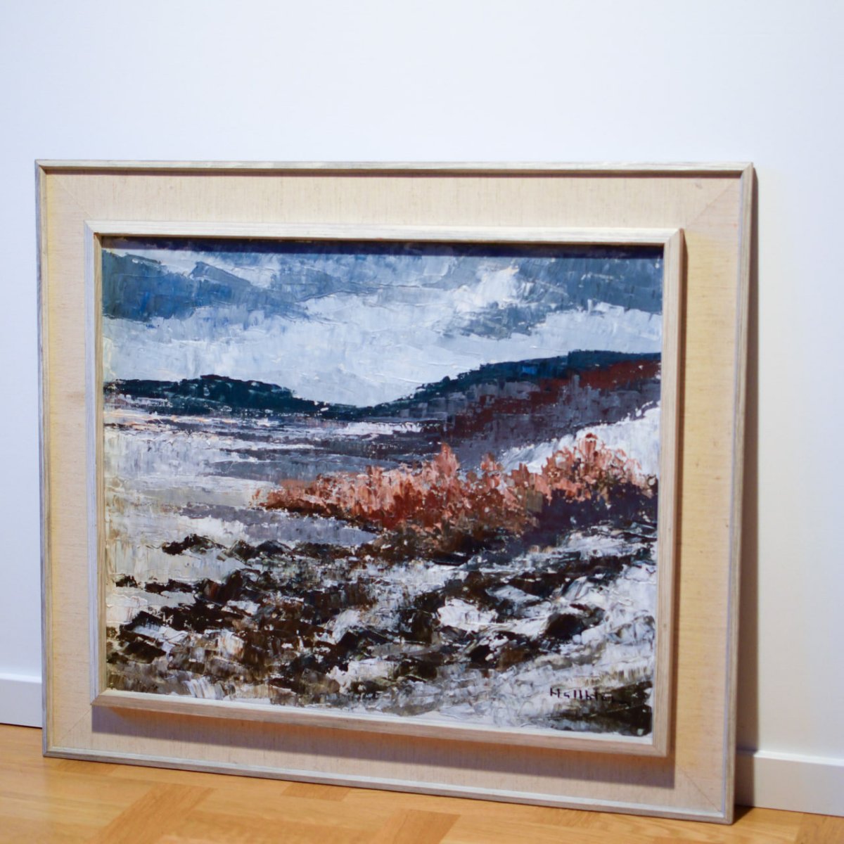 Stämningsfull landskapsmålning av den svenske konstnären Stig Anders Bertil Hallblom (f. 1932, Uppsala), autodidakt målare känd för sina expressionistiska tolkningar av uppländska naturmotiv. Verket mäter 77 cm x 66 cm inklusive ram och är ett vackert exempel på Hallbloms karakteristiska måleriska stil, där kraftfulla penseldrag och rik textur skapar en levande och dramatisk landskapsupplevelse.