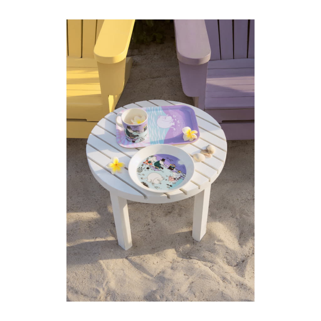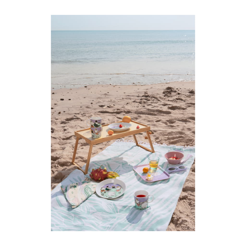 För mumintrollen är varje dag perfekt för en picknick på stranden. En dag vill Snorkfröken att Mumintrollet följer med, men Mumintrollet blir distraherad av några knappar och träffar istället Klått-djuret. De blir vänner direkt och Klått-djuret följer med till stranden. Muminmamman dukar upp en picknick! Moomin Arabia bricka 27×20 cm, En dag på stranden