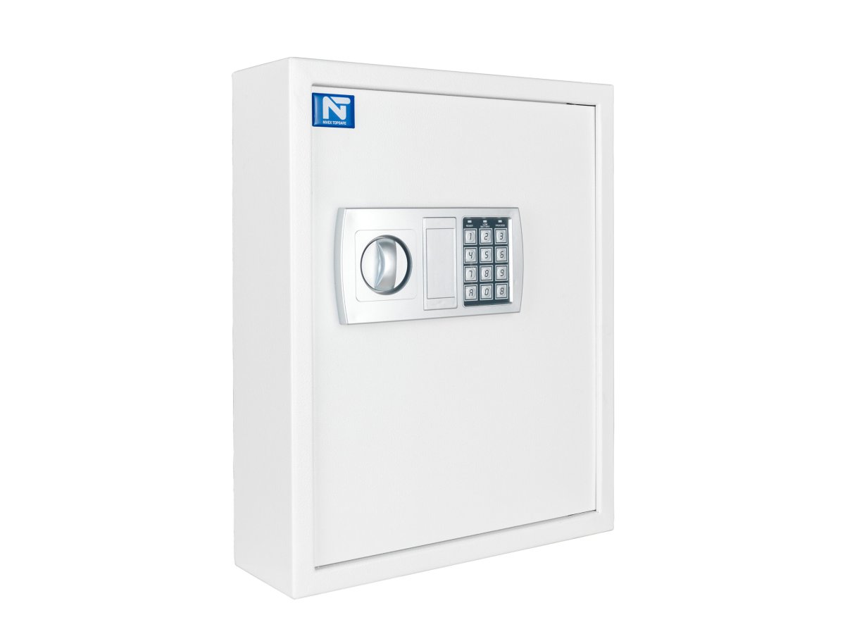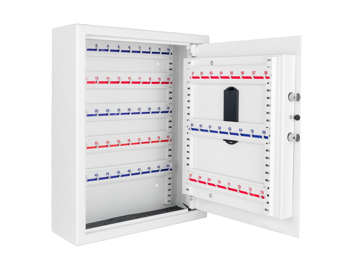 Nyckelskåp i tunnplåt med kodlås och nödöppningsnyckel. Skåpet är utrustat med 71st nyckelkrokar.
