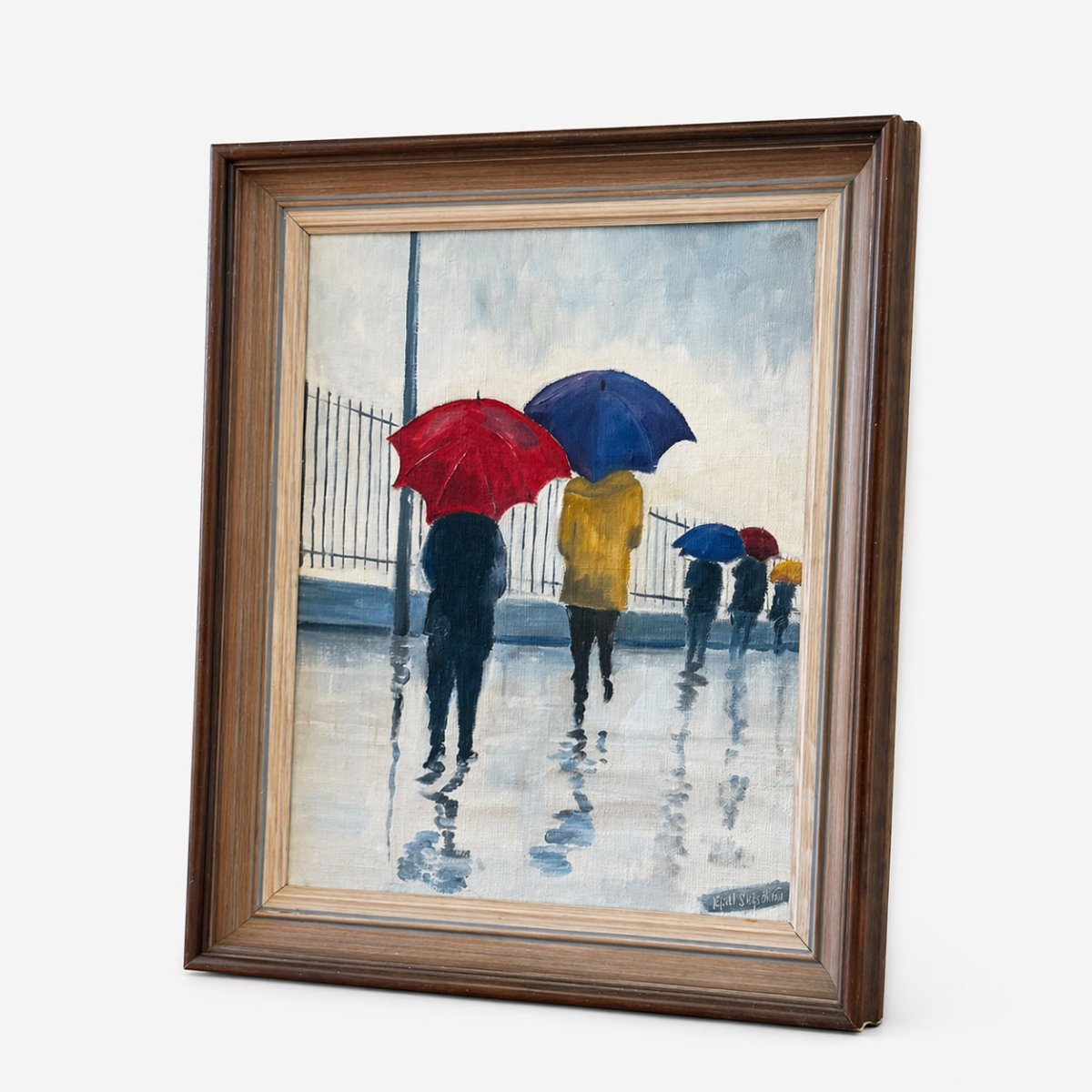 tämningsfull oljemålning som skildrar en regnig stadsscen där människor promenerar med färgstarka paraplyer. Mot den dämpade bakgrunden i grå och blå toner framträder paraplyerna i rött och blått som livfulla accenter, vilket skapar en fin kontrast och ett levande djup i motivet. Reflektionerna i den våta marken ger målningen ett mjukt och nästan poetiskt uttryck.