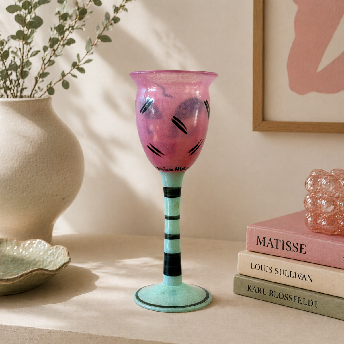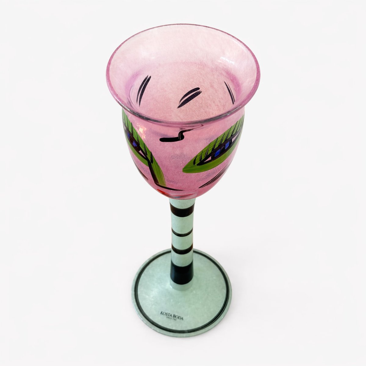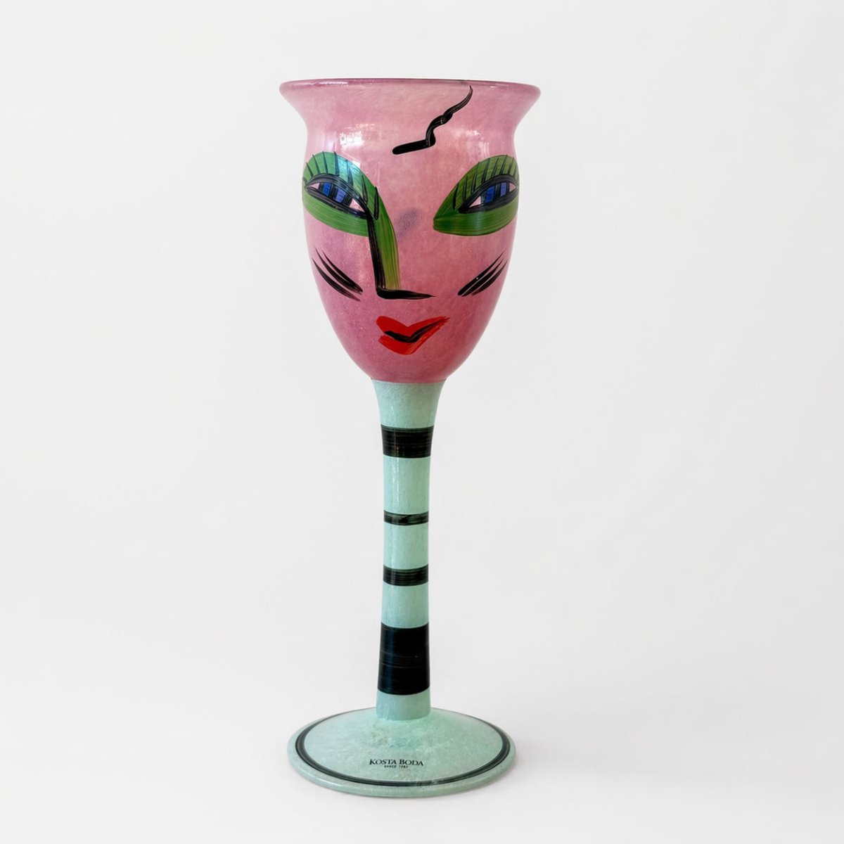 Ett uttrycksfullt och konstnärligt pokalglas ur den ikoniska serien “Open Minds”, formgiven av Ulrica Hydman-Vallien för Kosta Boda. Glaset är tillverkat i rosa och grönt glas och dekorerat med handmålade ansikten i konstnärens karakteristiska stil – lekfull, djärv och omedelbart igenkännbar.