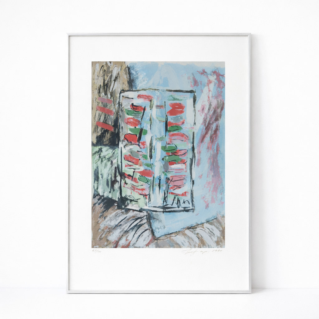 Uttrycksfull signerad litografi med ett abstrakt och färgstarkt motiv i mjuka pastelltoner kombinerat med livfulla inslag av rött och grönt. Kompositionen har en fri och konstnärlig känsla med spontana linjer och penseldrag som ger verket djup och rörelse.
