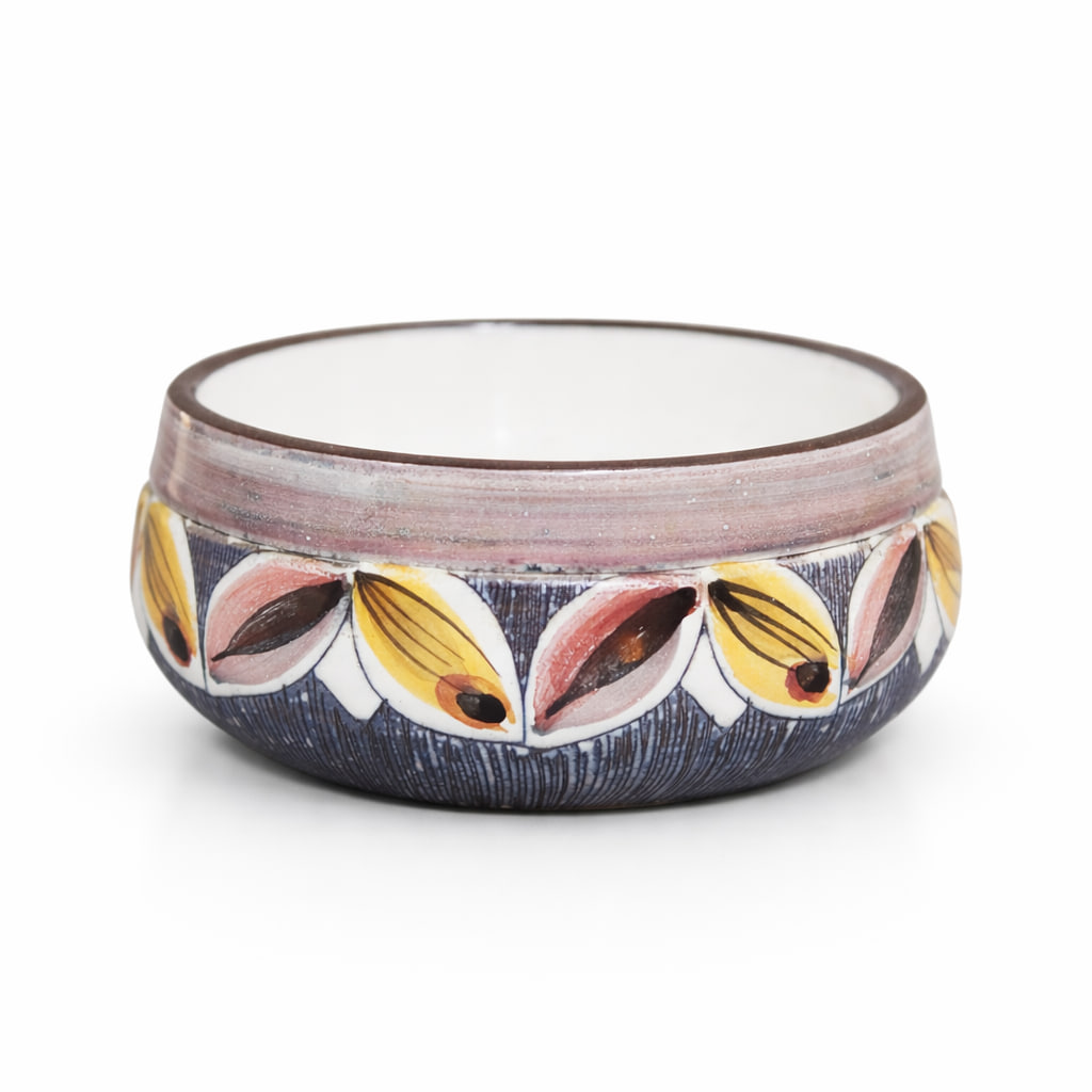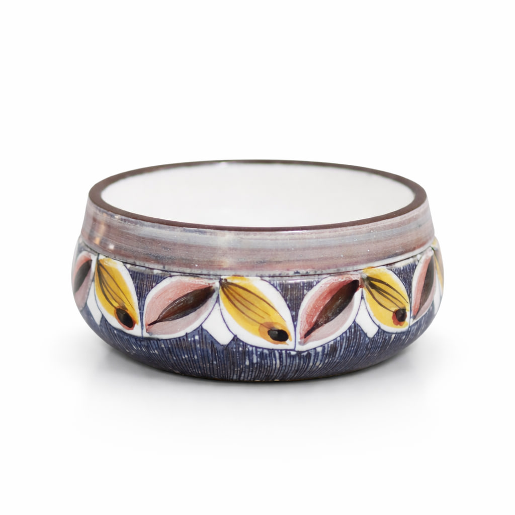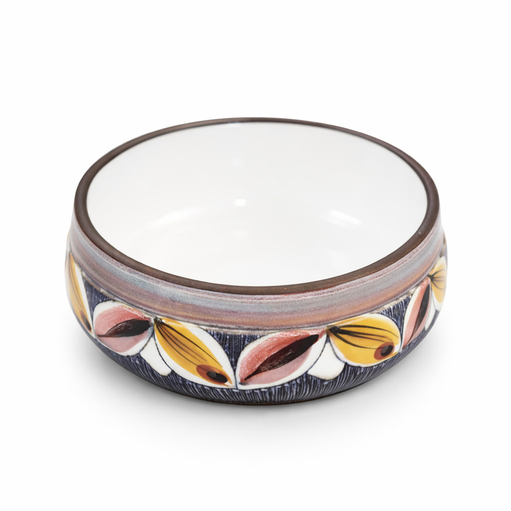 Ett fint exempel på svensk verkstadskeramik där hantverk och dekor samverkar. Skålen passar lika bra som serveringsskål som dekorativ detalj på bord eller hylla.