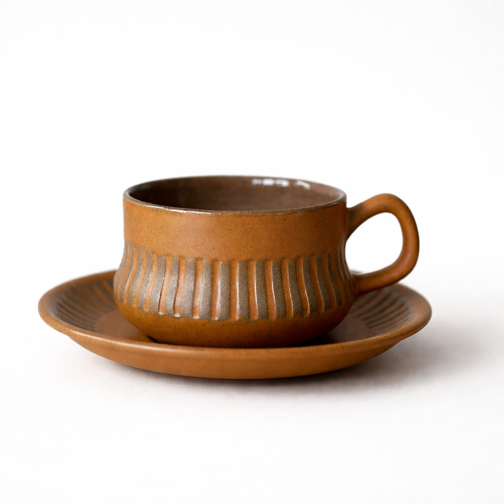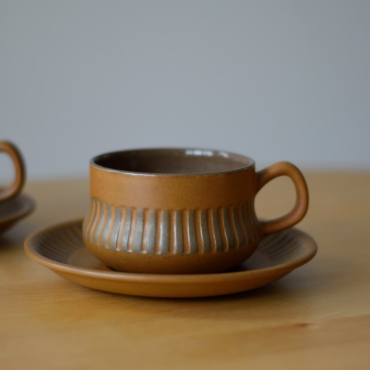 Vacker och tidstypisk tekopp ur serien ”Kosmos”, formgiven av Berit Ternell för Gefle / Upsala Ekeby under 1960-talet. Koppen är tillverkad i brun stengods med ett dekorativt reliefmönster längs nederdelen – samma formgivning som den ikoniska tekannan i serien.