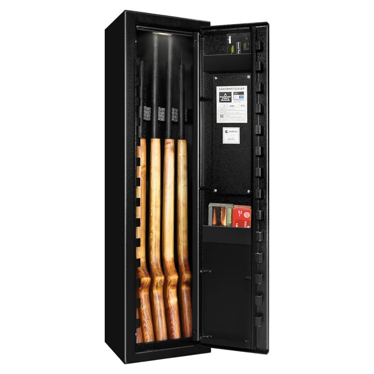 Vapenskåp med plats för upp till 5 gevär. Enligt vapenlagen ska säkerhetsskåp som understiger 150 kg förankras, skåpet är lätt att förankra tack vare fyra förankringshål i botten och i ryggen. Vapenskåpet är testat och certifierat enligt SSF3492 och godkänt för 20 poäng, vilket innebär att du i praktiken får förvara 20 stycken gevär alternativt 10 stycken pistoler eller 5 stycken helautomatiska vapen inuti skåpet.