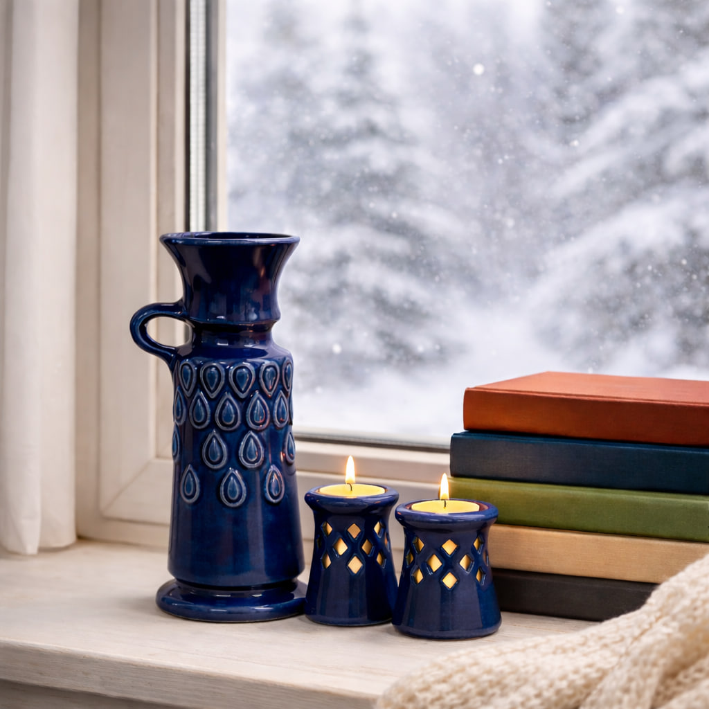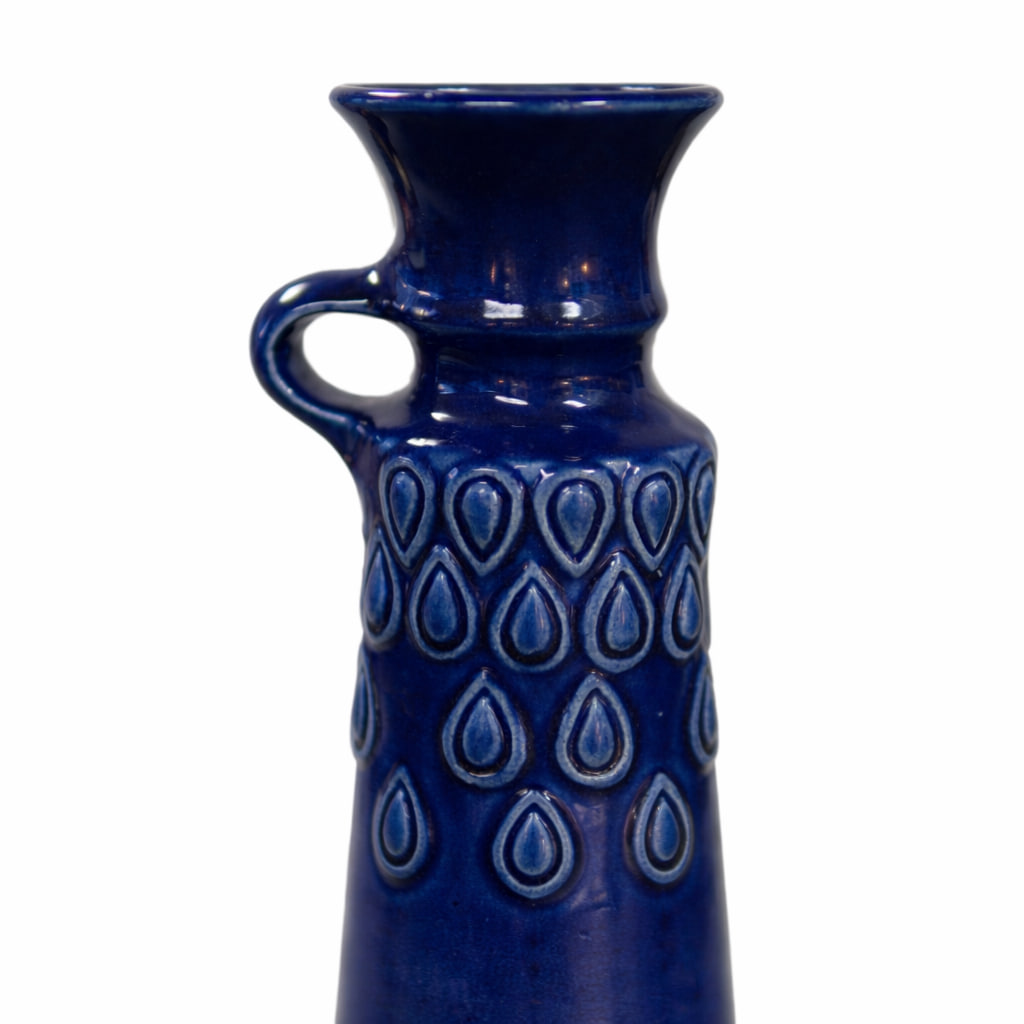 Dekorativ vas från tyska Jasba, modell N2071320, med en höjd på 20,5 cm. Vasen är tillverkad i glaserad keramik och har en djup, intensiv blå färg som ger ett starkt visuellt uttryck. Den reliefdekorerade ytan med droppformade mönster skapar liv och struktur och är typisk för Jasbas formspråk under mitten av 1900-talet.