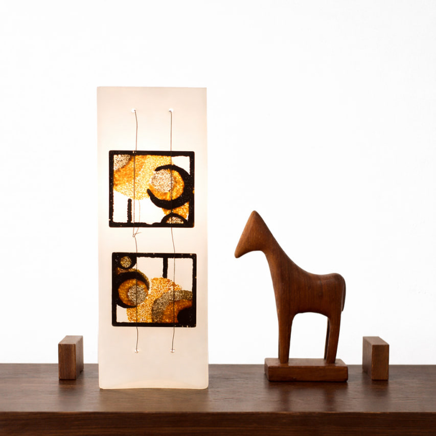 Stilren vintage bordslampa i opalt vitt glas med dekorativa konstglasdetaljer i geometriskt mönster. Lampan har två infällda glasskivor i brunt, bärnstensfärgat och svart ton, upphängda med tunna metalltrådar som skapar en svävande, modernistisk känsla. Ljuset sprids mjukt genom den matta glasytan och framhäver glasdekorationens textur och färgspel.