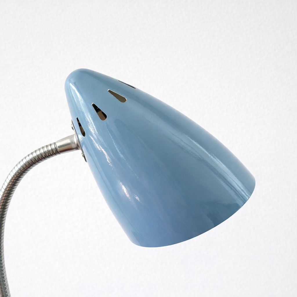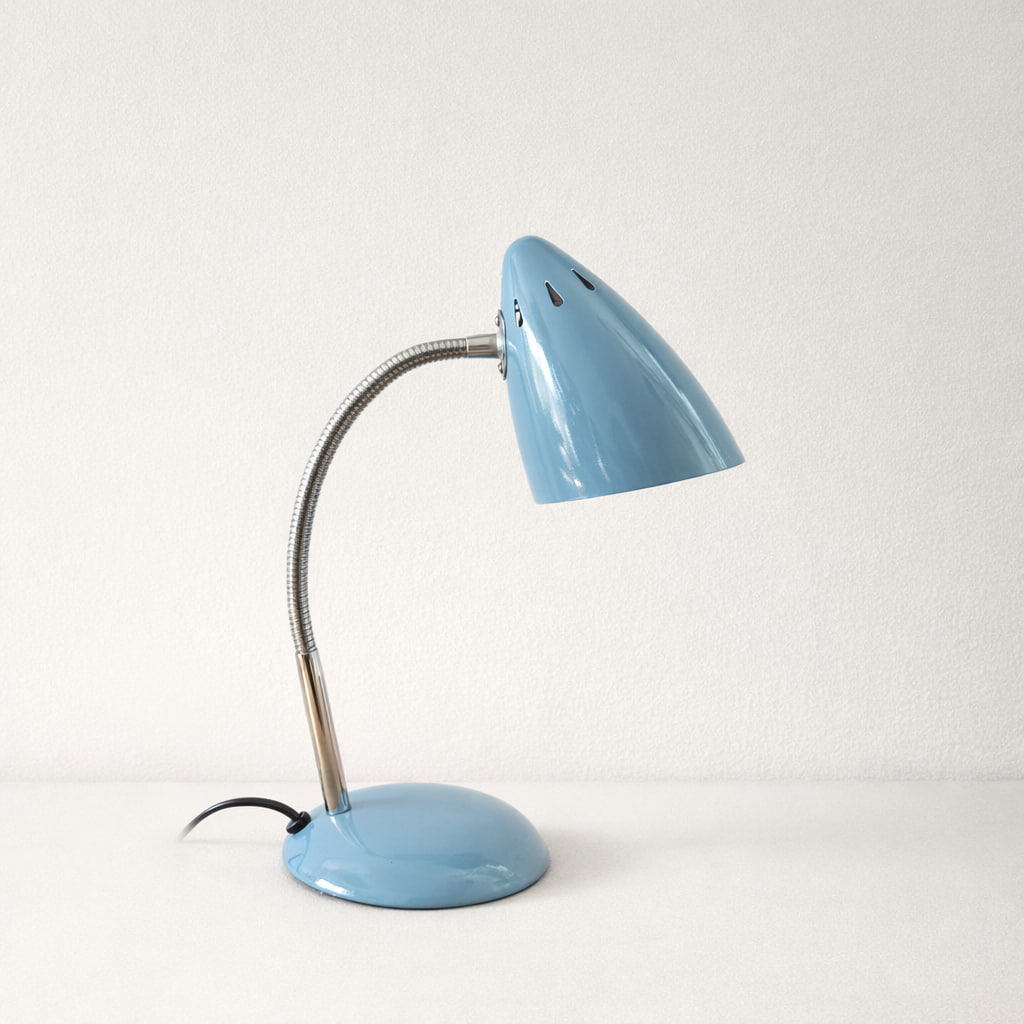 Charmig vintage bordslampa i en mjuk blå nyans som ger ett lekfullt men samtidigt stilrent uttryck. Lampan har en klassisk konformad skärm i lackerad metall och en flexibel böjbar arm i krom som gör det enkelt att rikta ljuset precis där du behöver det.
