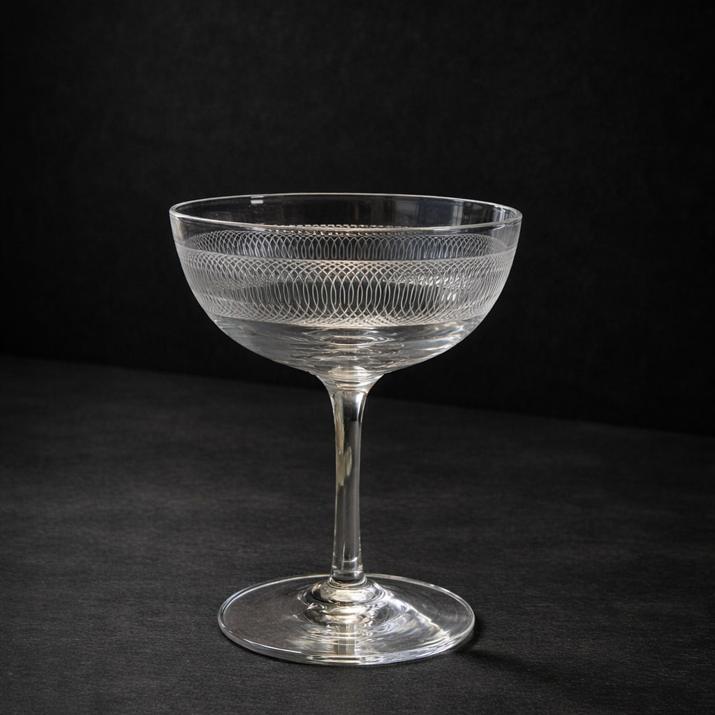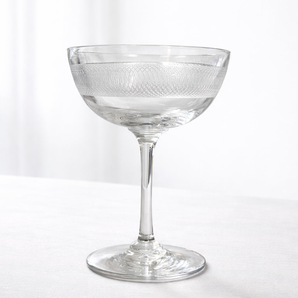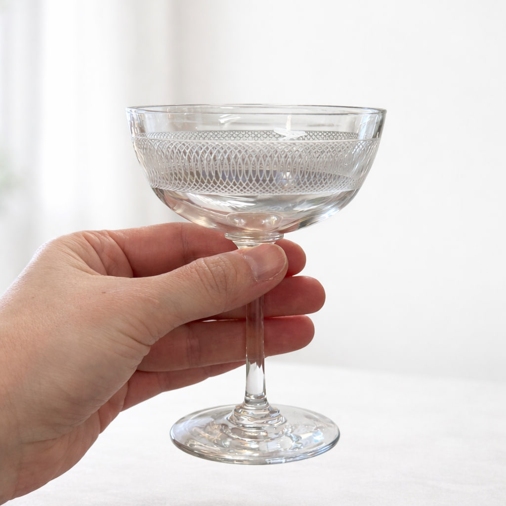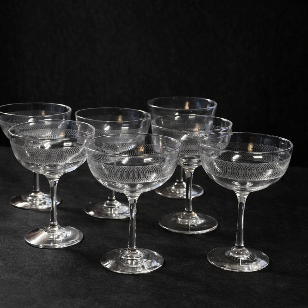 Elegant set med 7 vintage champagneglas från första halvan av 1900-talet. Glasen har en klassisk, tidlös form med låg kupa och stabil fot, vilket ger en sofistikerad känsla vid servering.