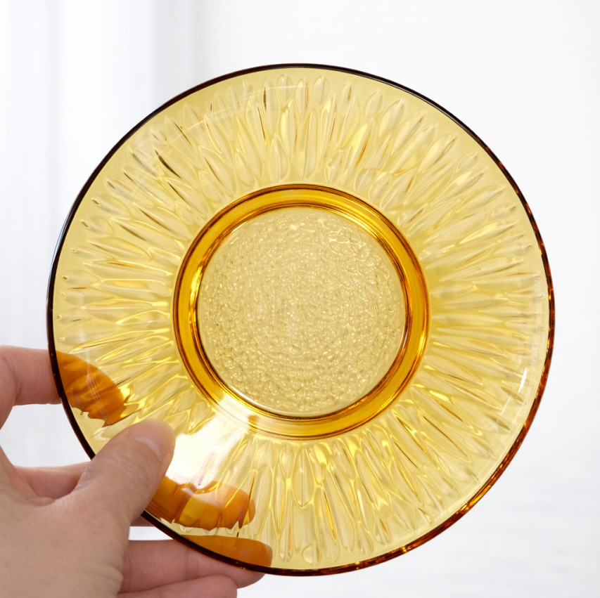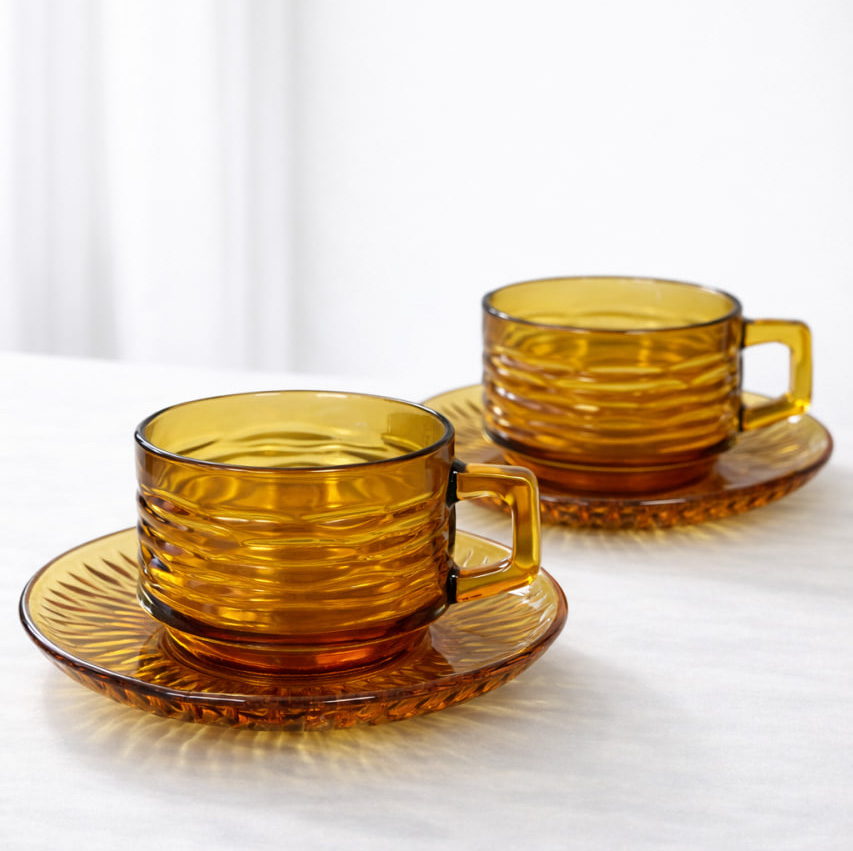 Kopparna har en räfflad yta som ger ett fint ljusspel i glaset, medan faten har en solfjäderliknande struktur som förstärker det retroinspirerade uttrycket. Den varma amberfärgen skapar en inbjudande känsla och gör dessa perfekta för både vardagsbruk och som dekorativa inslag i köket.