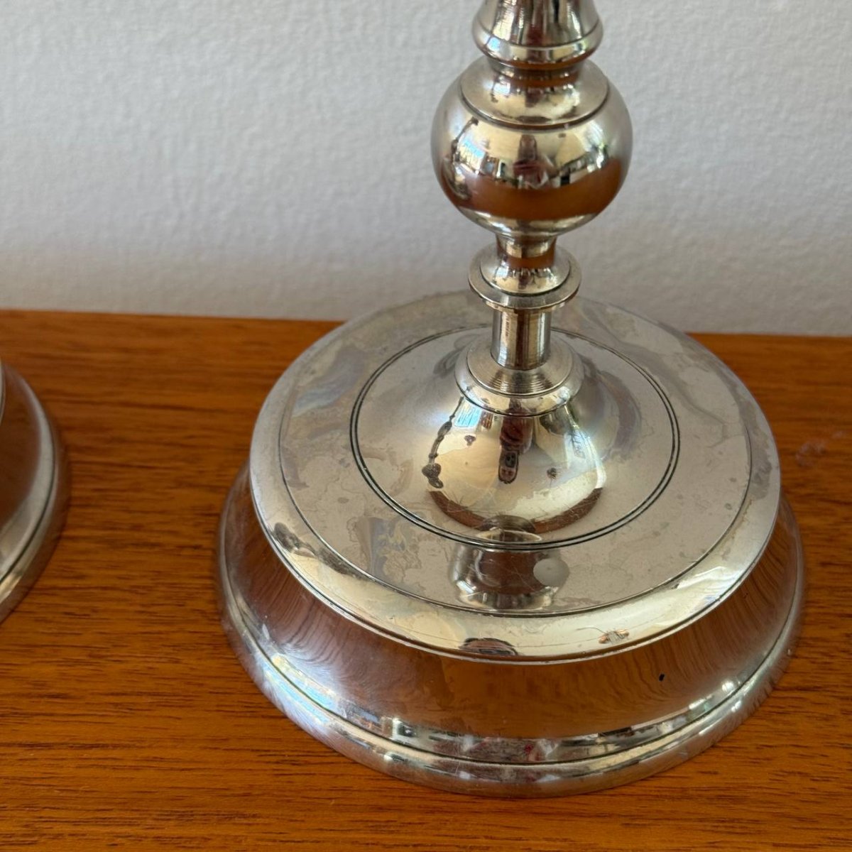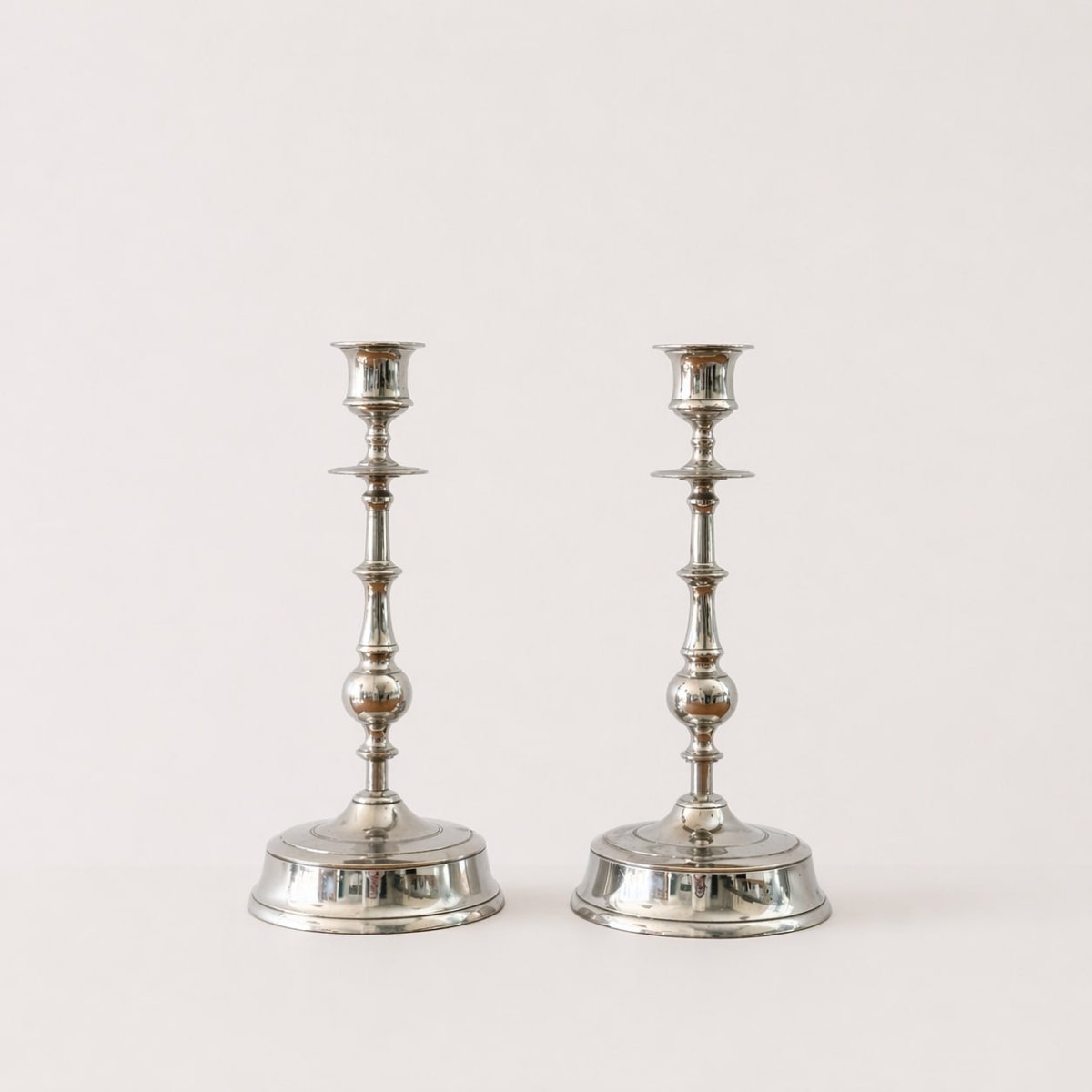Eleganta och tidstypiska ljusstakar från Carl Kejser & Co i Västerås, modell N 63, tillverkade i förnicklad mässing. Den stilrena formen med svarvade detaljer och balanserade proportioner ger ett klassiskt uttryck som passar både i traditionella och moderna hem. Den förnicklade ytan ger ett vackert silvrigt skimmer som reflekterar ljuset mjukt och skapar en varm och inbjudande atmosfär.