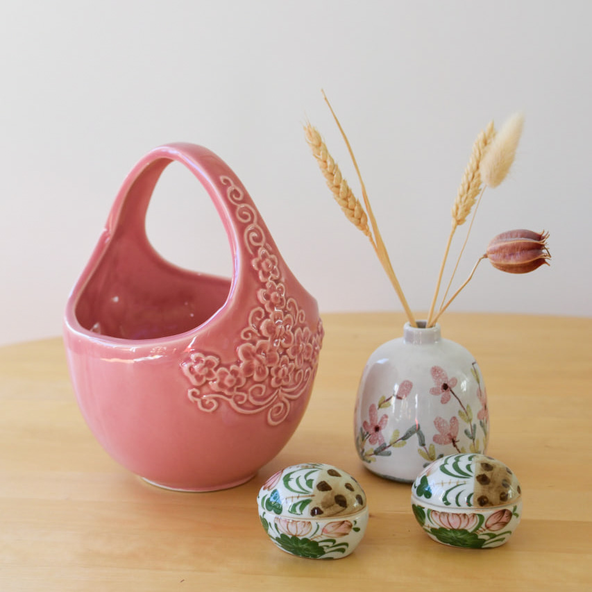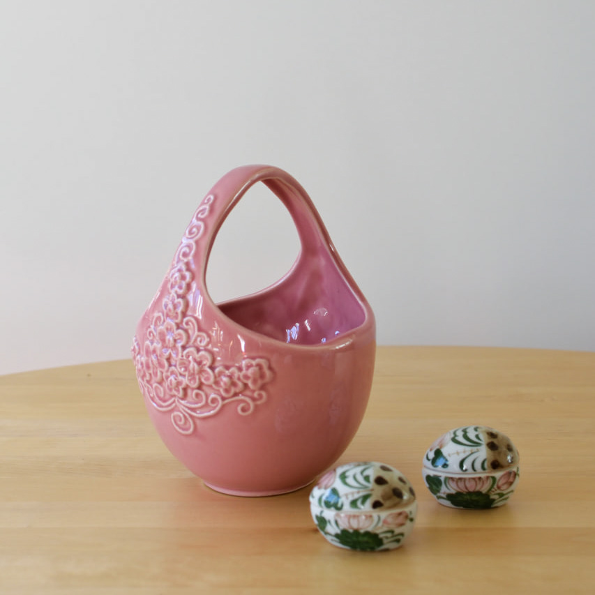 Denna vackra och sällsynta påskkorg i porslin från Guldkroken är en fantastisk detalj för din påskdukning eller vårdekoration. Tillverkad på 1980-talet, har den en mjukt rosa glasyr med en vackert reliefdekorerad blomsterslinga på ena sidan. Korgen har en elegant, välvd handtagsform som ger den ett tidlöst uttryck. Perfekt att använda som blomkruka, godisskål eller som en unik inredningsdetalj.