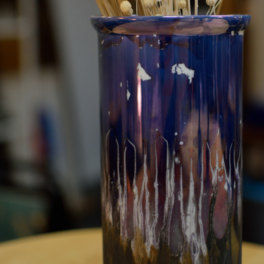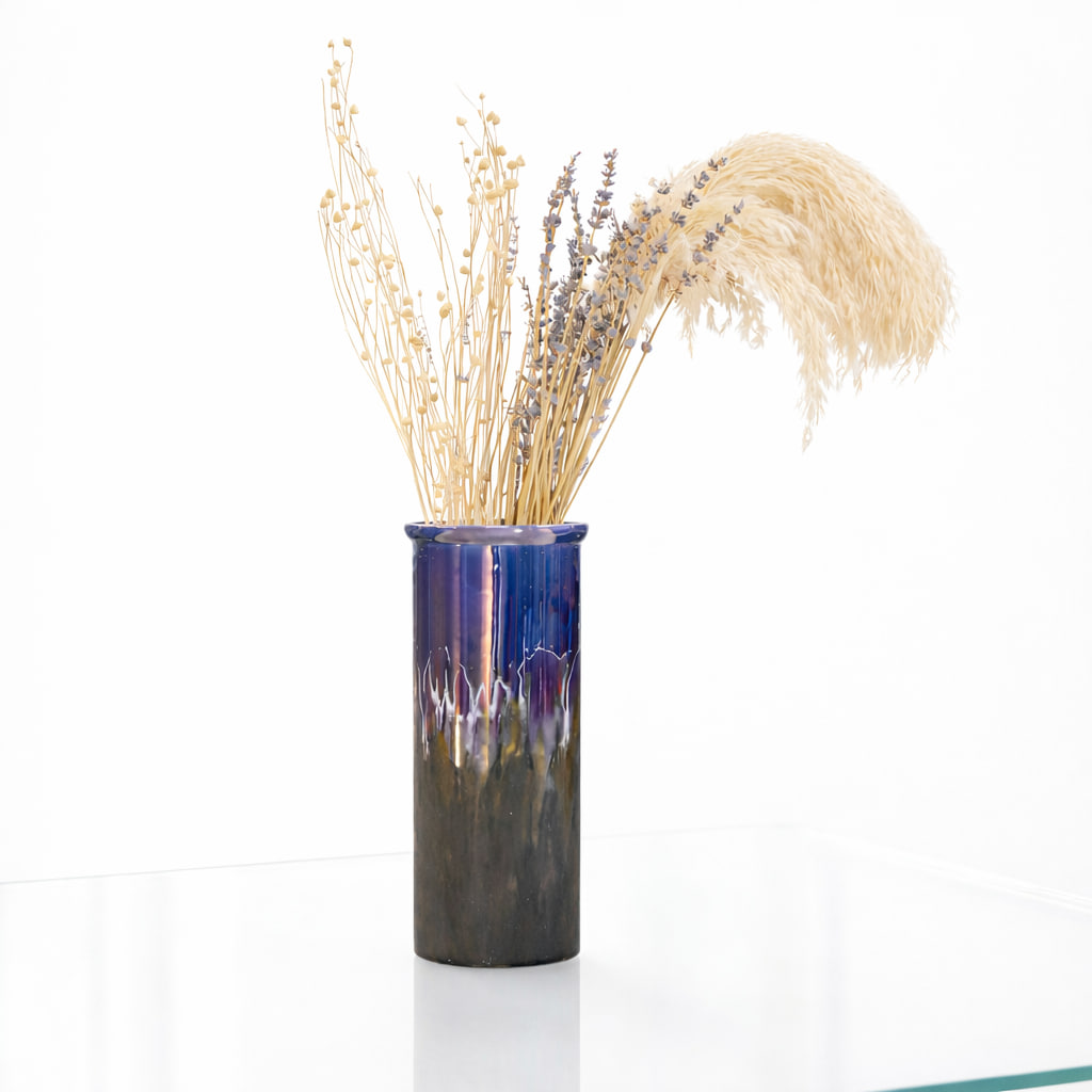 Glasyren rör sig i ett flödande spel mellan djupblått, lila och mörkbrunt, med droppformade vita rinn som ger en känsla av rörelse och naturlig struktur. Denna kombination skapar ett effektfullt, nästan vulkaniskt intryck – som ett möte mellan himmel och jord.